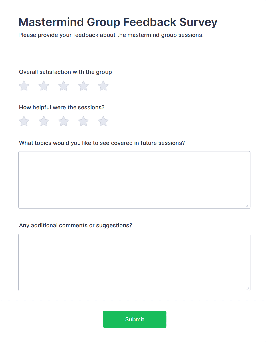 A coaching session client feedback survey is a questionnaire used by coaches to collect feedback from their coaching clients.