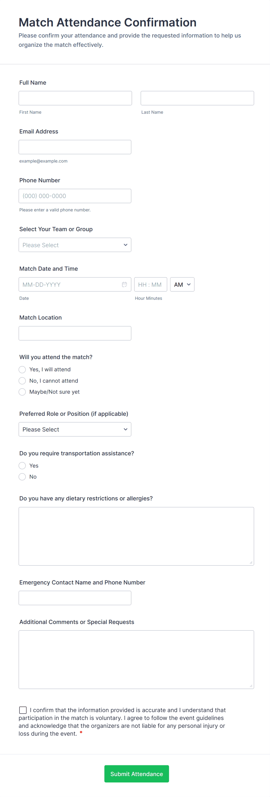 Attendance Form Templates are pre-designed digital forms used to track, record, and manage attendance for a variety of events, activities, and organizations. Whether you’re organizing a classroom, a corporate training session, a community event, or a volunteer program, these templates help streamline the process of collecting participant information and monitoring presence. Attendance forms can be tailored for daily check-ins, event sign-ins, employee time tracking, or even remote attendance verification, making them versatile tools for educators, HR professionals, event coordinators, and team leaders.