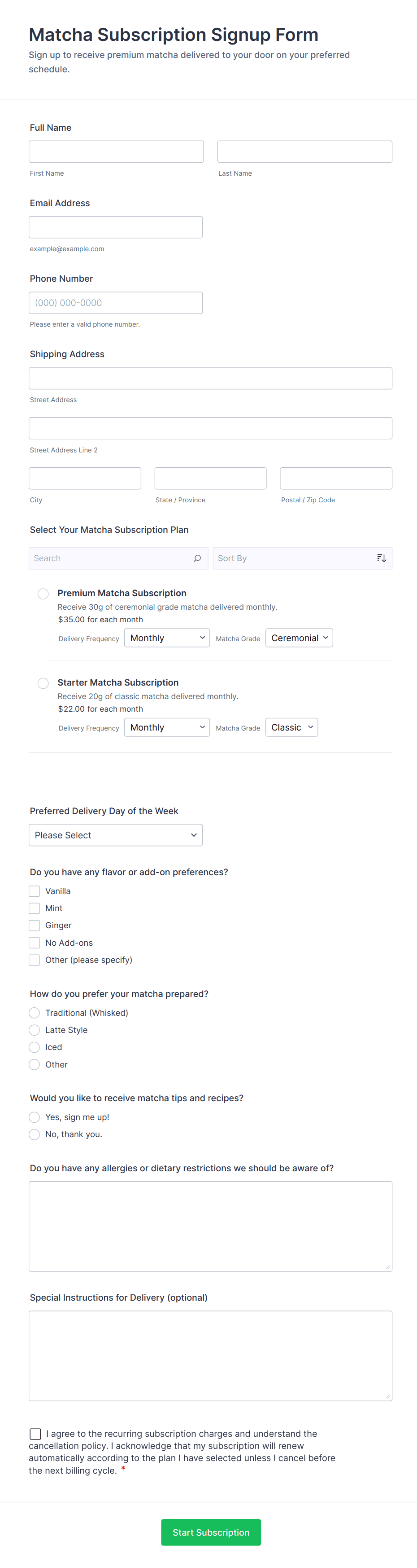 A subscription form is an online form used to collect information from individuals who wish to sign up for recurring services, communications, or memberships, such as newsletters, product deliveries, or club memberships.