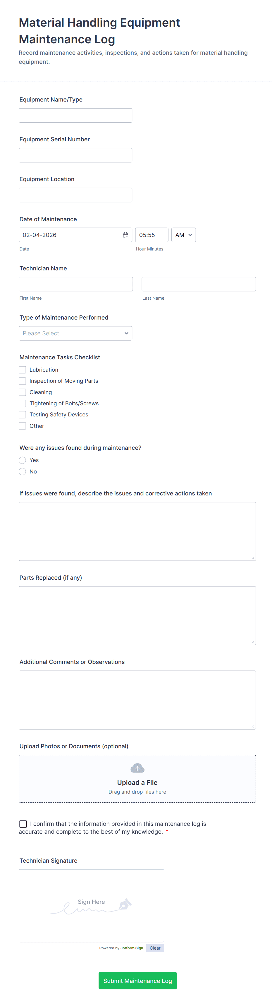 Creating an equipment maintenance form with Jotform helps you standardize maintenance reporting and keep service history organized and easy to track.