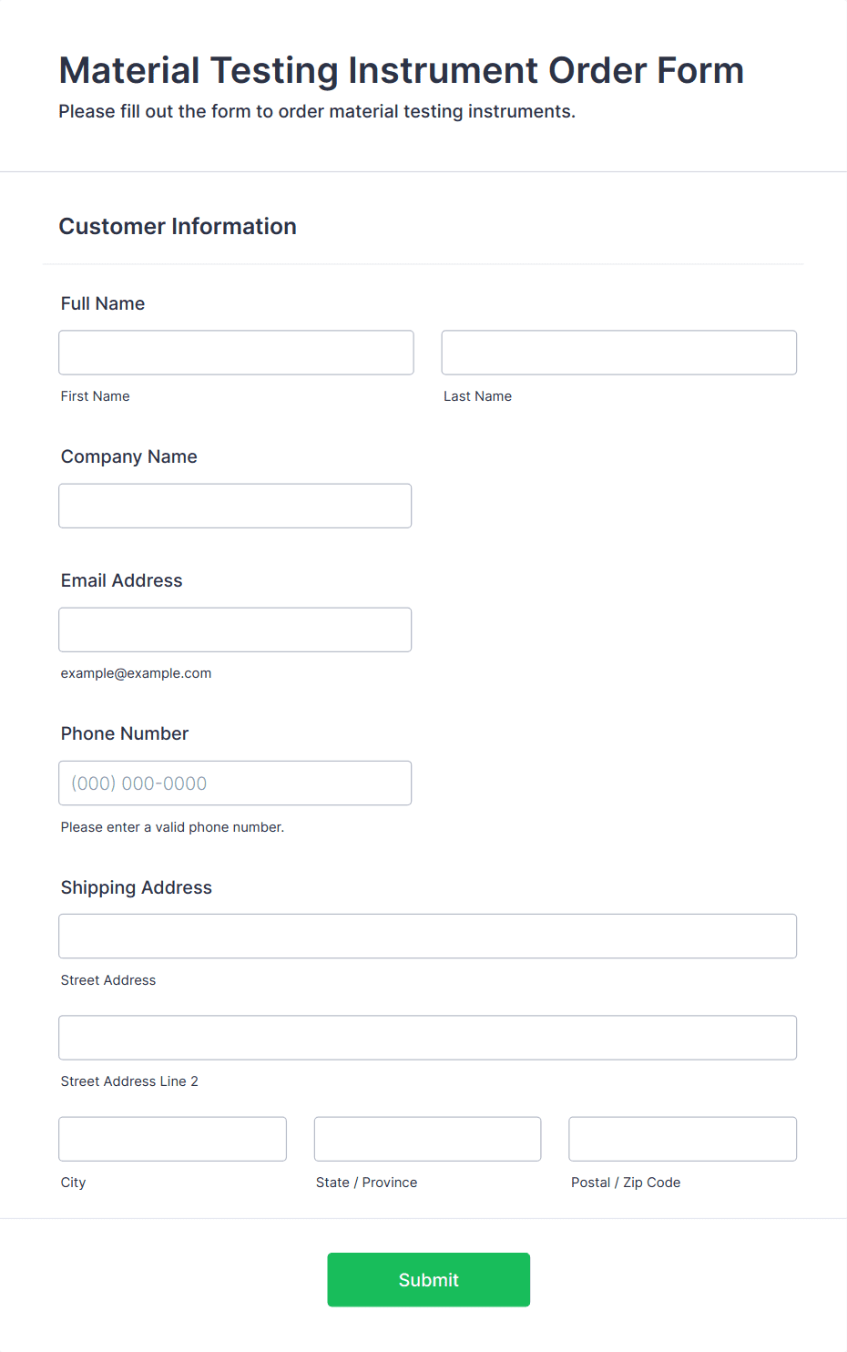 The Material Testing Instrument Order Form from Jotform is a customizable form template built with Jotform Form Builder to streamline data collection, form submission, and ordering via a drag-and-drop interface for labs and manufacturing teams.