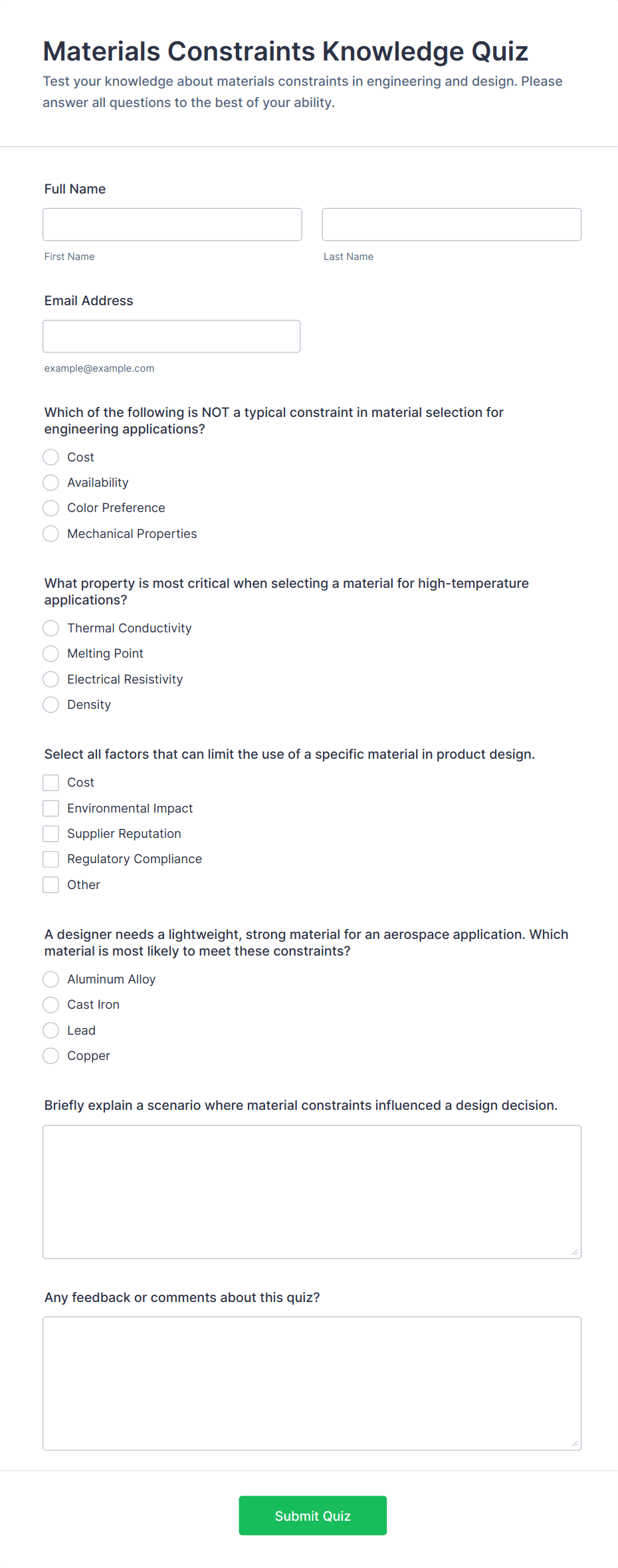 Quiz Templates are pre-designed forms specifically created to facilitate the process of building quizzes for a variety of purposes, such as education, employee training, lead generation, event engagement, and more. These templates provide a structured way to present questions, collect answers, and automatically score or evaluate responses. Whether you’re a teacher assessing student knowledge, a business running a product knowledge test, or a marketer creating a fun personality quiz, Quiz Templates offer a flexible foundation to suit your needs. They can be used for online exams, trivia games, onboarding assessments, customer feedback quizzes, and interactive learning modules.