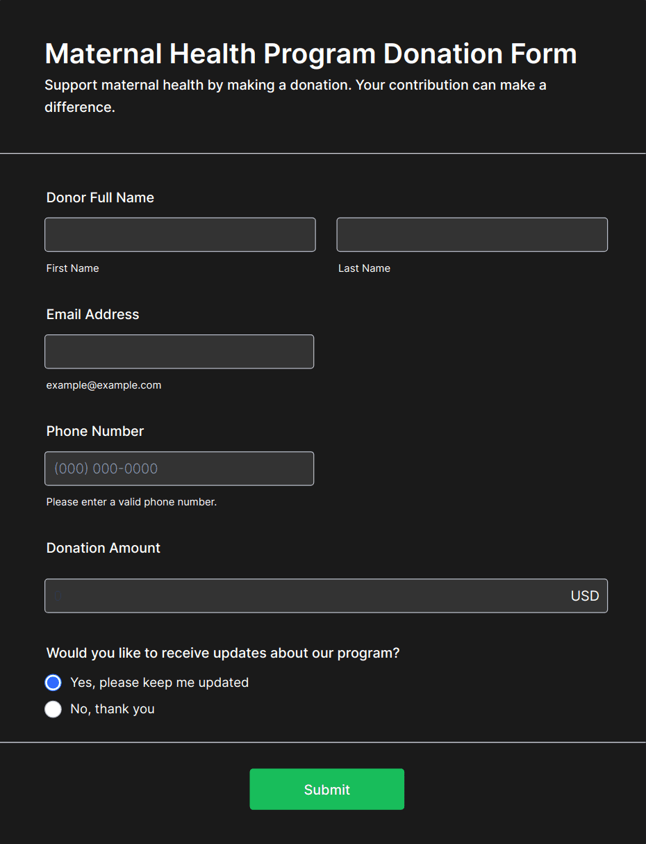 Donation forms are specialized online forms designed to collect contributions for charitable organizations, fundraising campaigns, nonprofit initiatives, and community projects. These forms streamline the process of gathering donor information, processing payments, and tracking contributions, making it easier for organizations to raise funds efficiently. Donation forms can be used for a variety of purposes, such as one-time or recurring donations, event sponsorships, crowdfunding efforts, membership drives, and emergency relief campaigns. They are essential tools for nonprofits, schools, religious groups, and community organizations seeking to engage supporters and facilitate secure, convenient giving.
