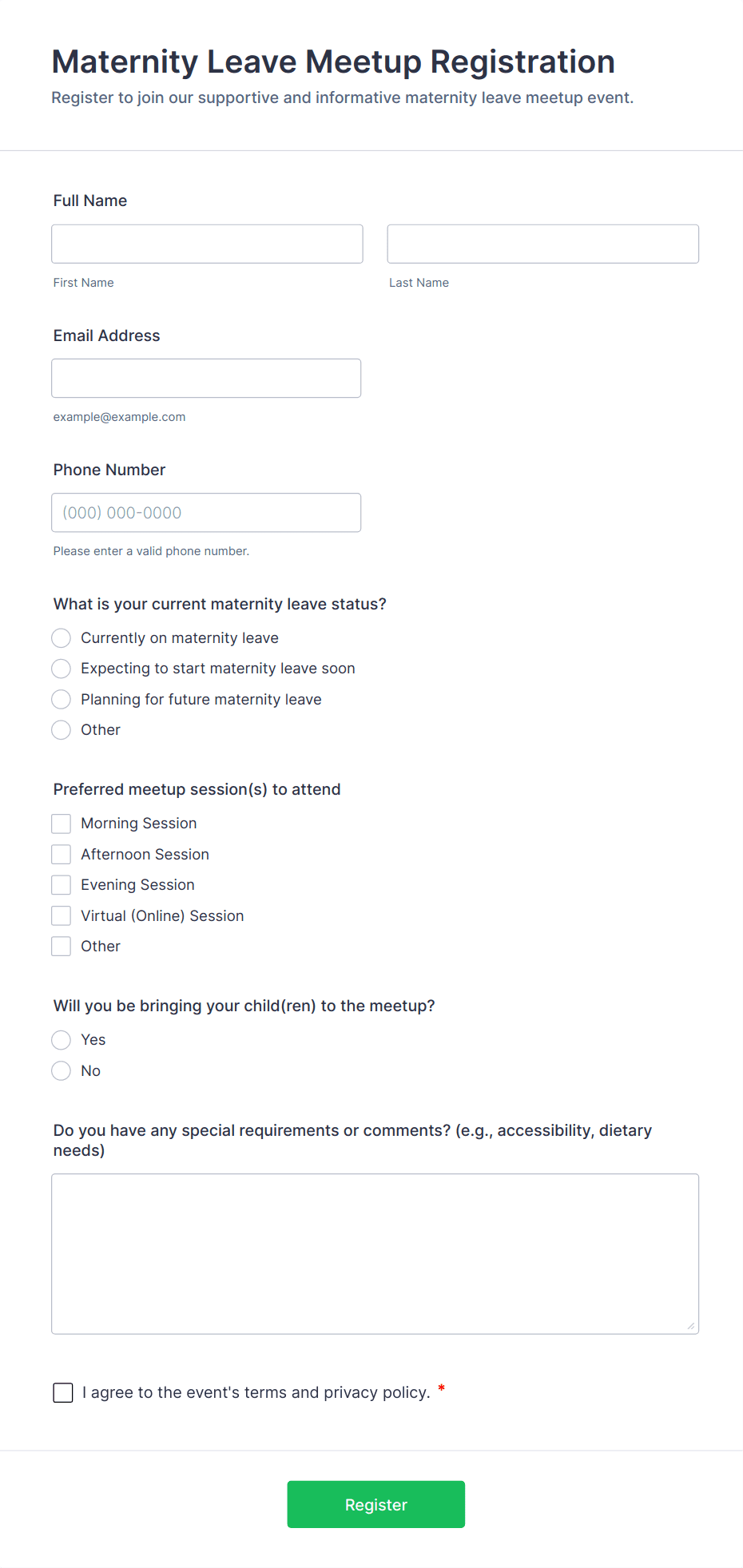 Yes, forms can be customized for paid or free events, single or multi-session workshops, in-person or virtual formats, and for different age groups or industries.