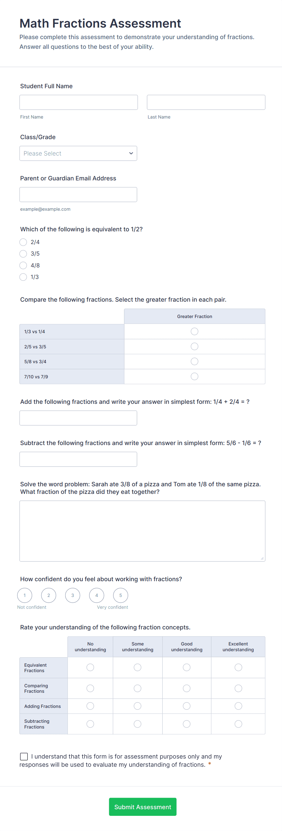 Math Fractions Assessment Form Template for teachers and tutors to collect student responses online, review form submission data in Jotform, and track understanding of fraction skills using a customizable assessment from Jotform Form Templates.