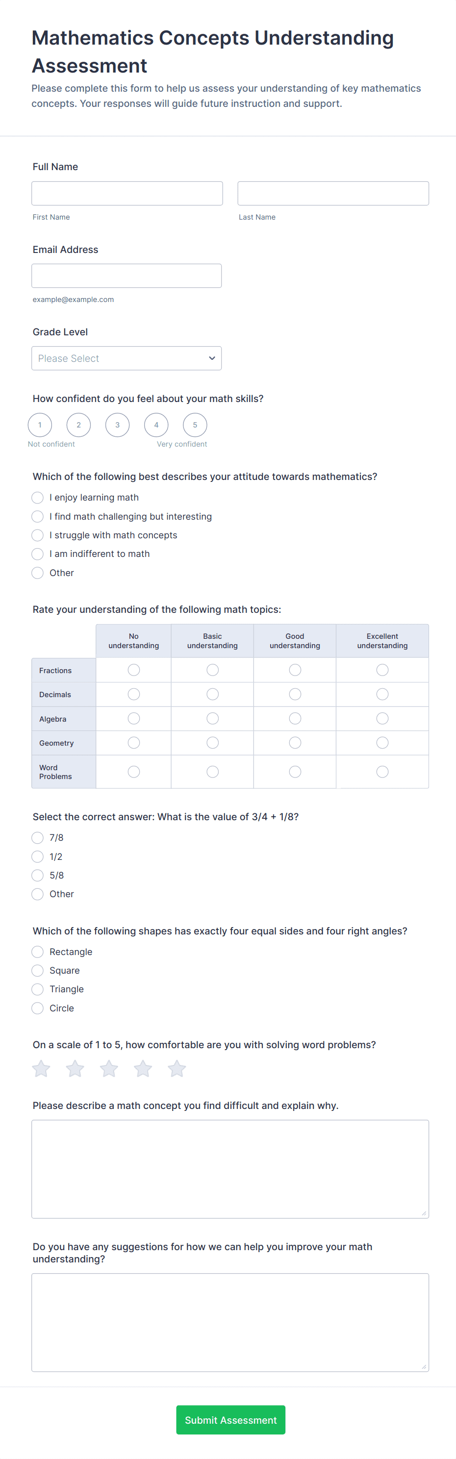 Collect second-grade learning checks online with the Second Grade Student Assessment Quiz, a Jotform form template for quick classroom data collection, simple review, and organized form submission tracking for teachers and schools.