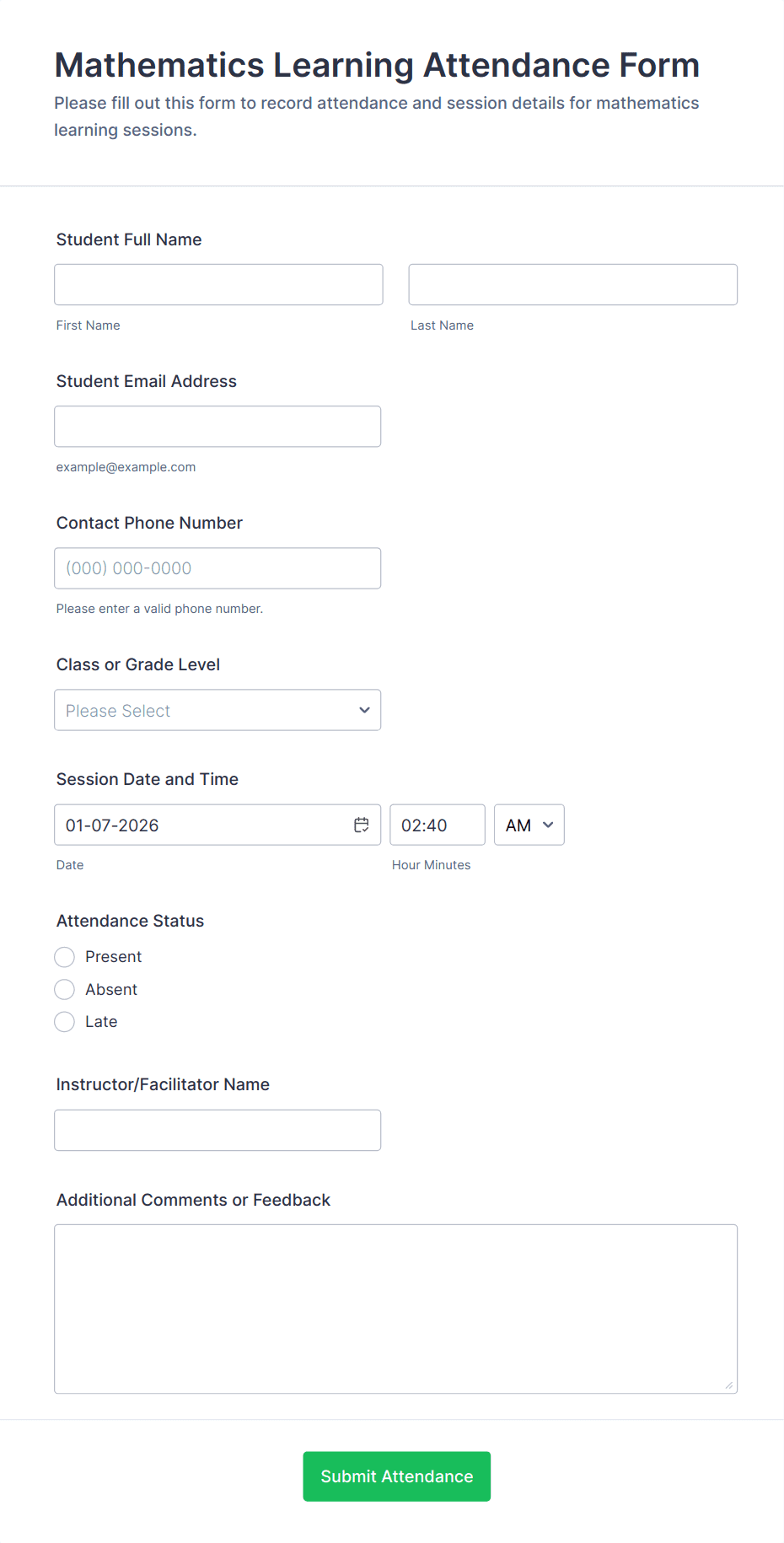 An attendance form is a digital or paper-based tool used to record the presence or absence of individuals at an event, class, meeting, or workplace.