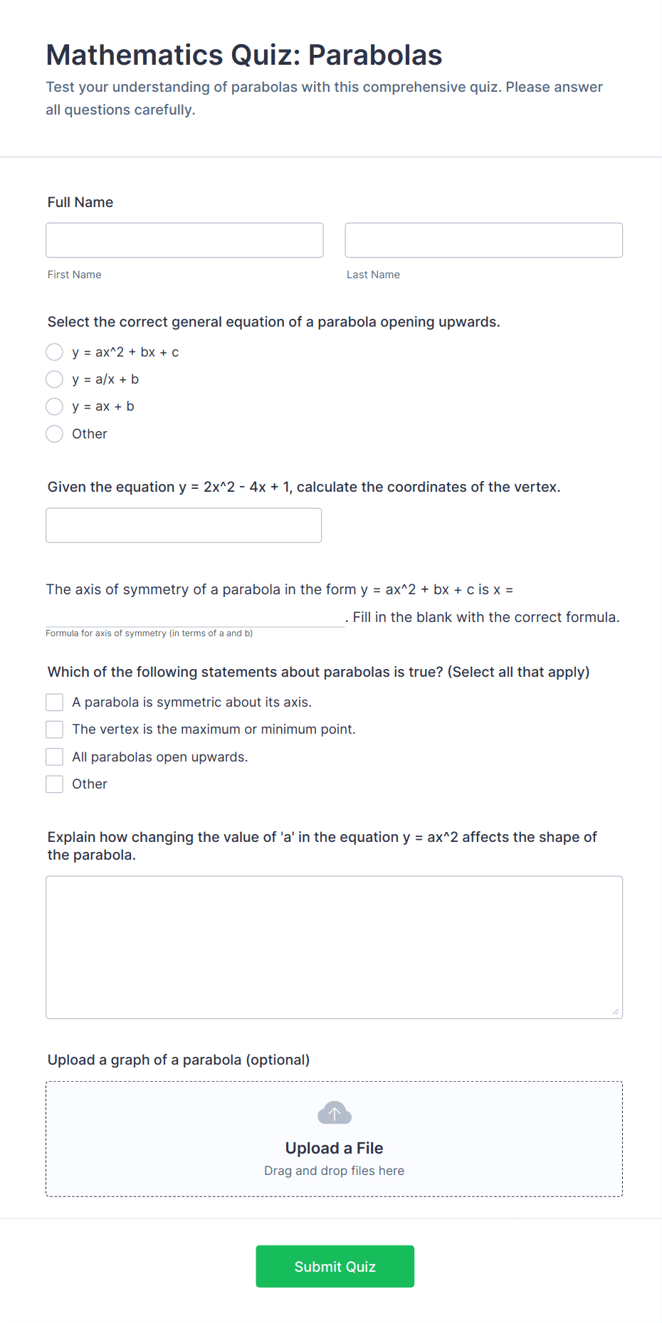 Create a quiz with a Quiz Form on your webpage. Collect answers from your website visitors with a secure Quiz Form widget.