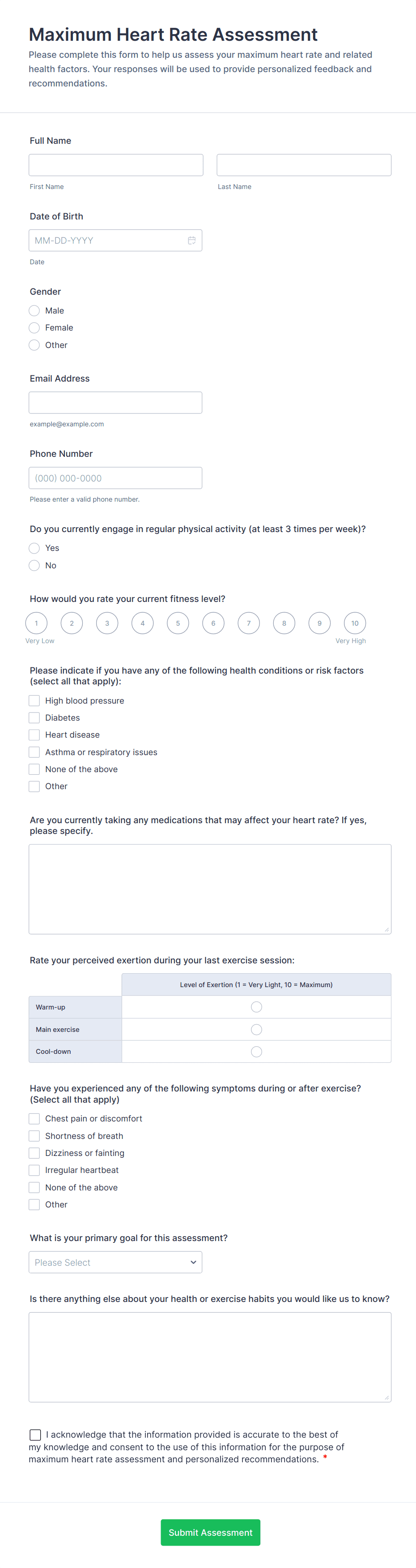 Add fields for symptoms, medical history, medications, allergies, lifestyle factors, and functional status depending on the assessment type. Use rating scales for severity and impact.