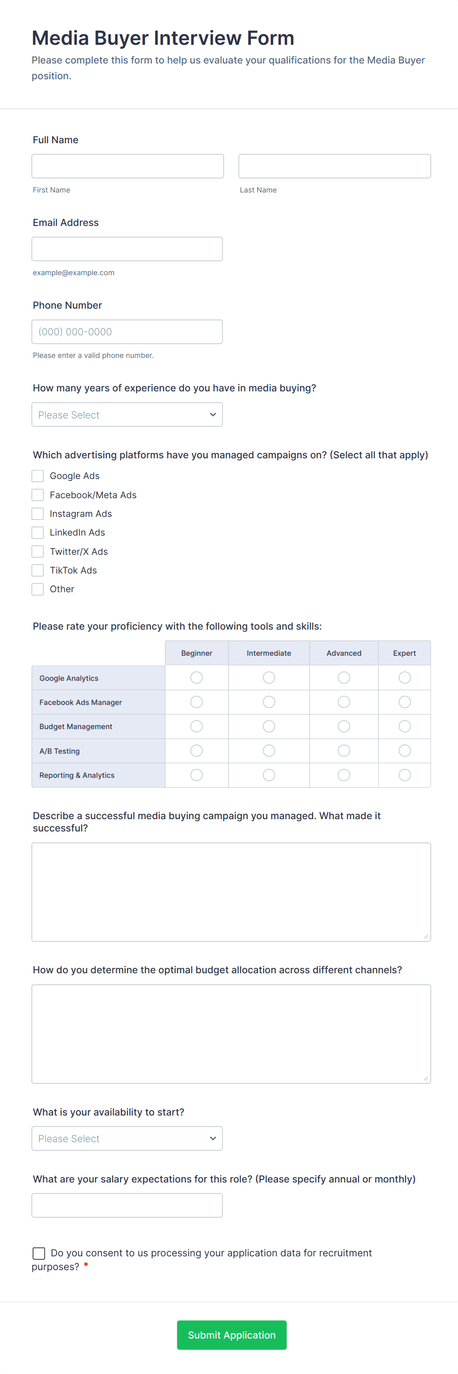 The Customer Support Interview Form helps HR professionals collect candidate information for customer service roles, streamlining the interview process and improving data collection.