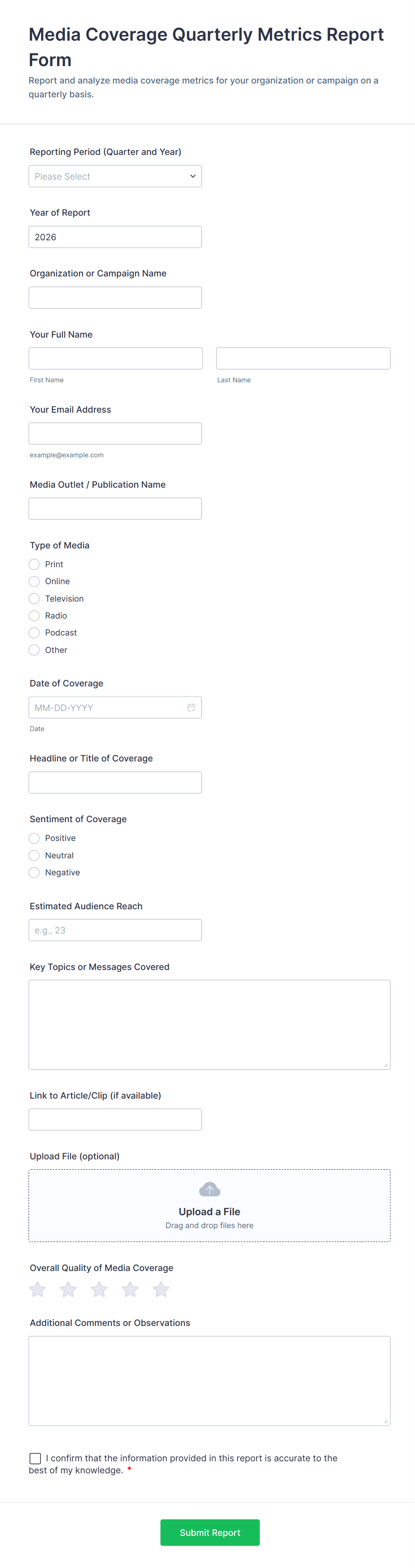 Report templates are pre-designed documents or digital forms used to collect, organize, and present data in a structured and visually appealing manner. They serve a wide range of purposes, from summarizing survey results and tracking project progress to compiling financial data and generating performance reviews. Report templates help standardize the reporting process, ensuring consistency and clarity across different teams or departments. Common use cases include business analytics, academic research, incident reporting, sales tracking, and compliance documentation, making them essential tools for organizations seeking to streamline data collection and analysis.