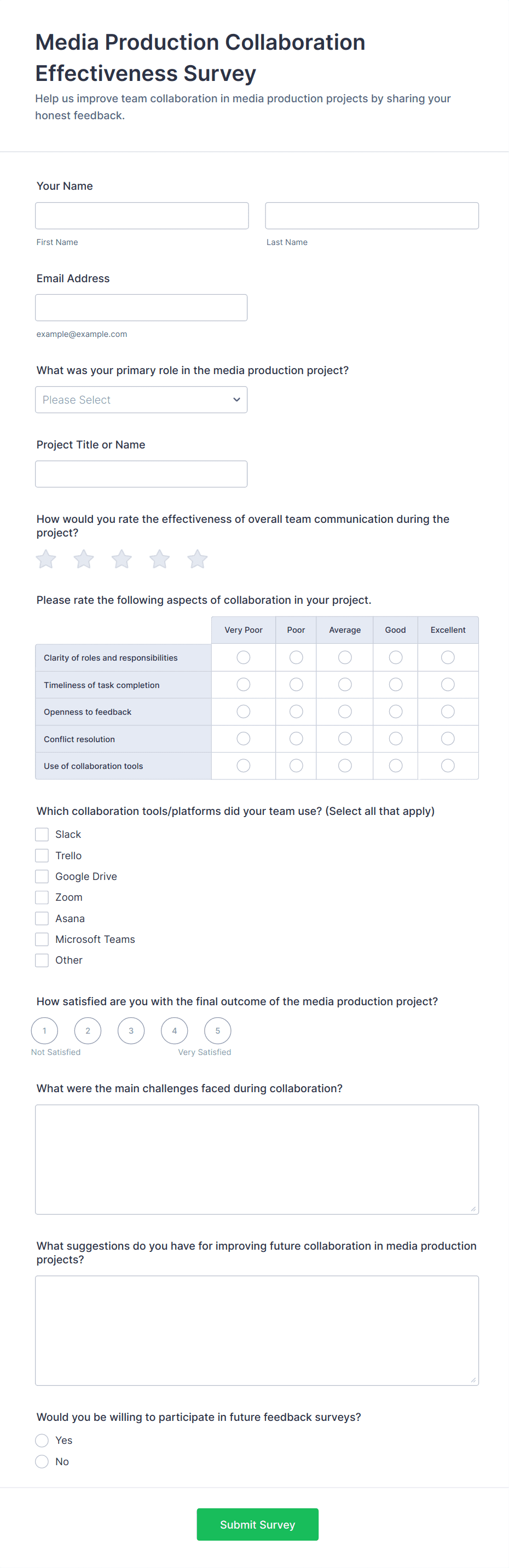 For employee surveys, consider adding anonymity options; for customer surveys, include contact fields if follow-up is needed.