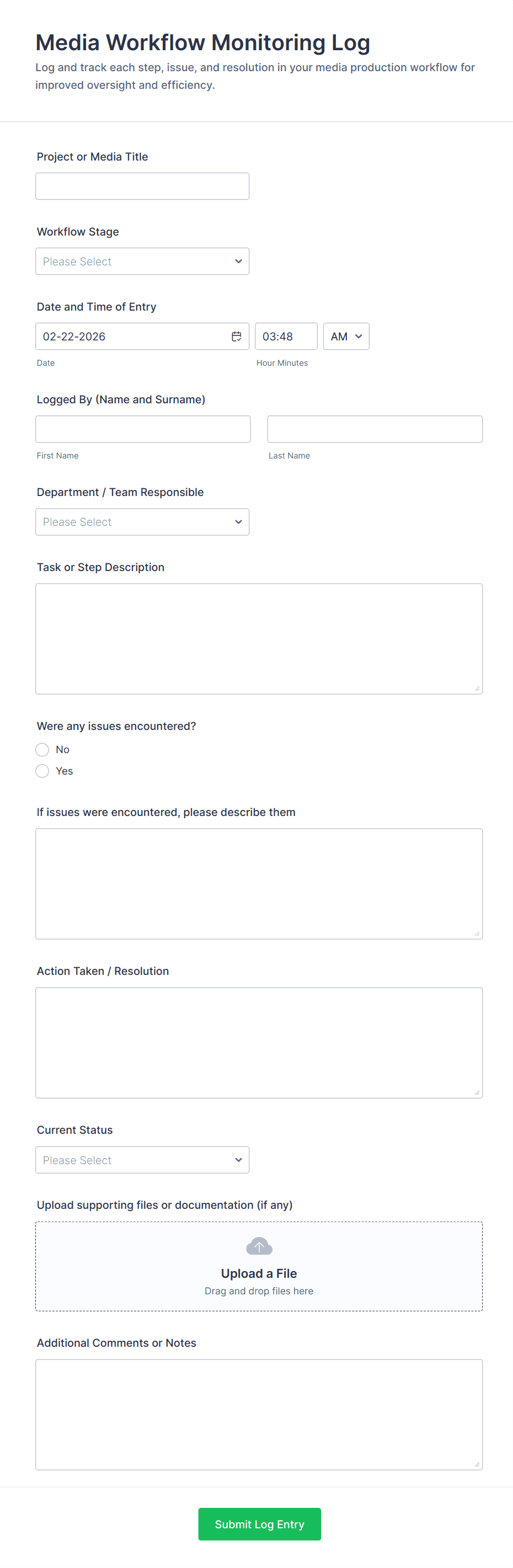 - Equipment Monitoring Forms: Require asset identification fields, maintenance schedules, and status dropdowns.