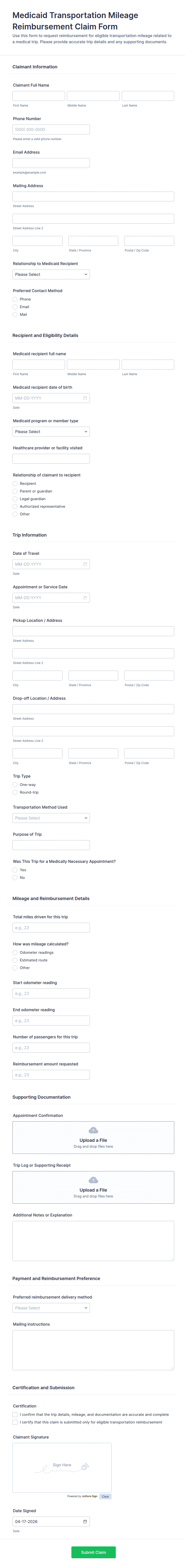 - For travel reimbursements, include fields for travel dates, destinations, and transportation details.