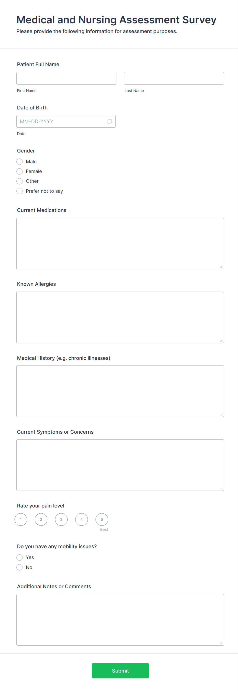Medical surveys and questionnaires are essential tools used by healthcare professionals, researchers, clinics, and organizations to collect valuable information about patients’ health, medical histories, symptoms, treatment outcomes, and overall well-being. These forms can be used for a variety of purposes, such as patient intake, health risk assessments, satisfaction surveys, mental health screenings, post-visit feedback, and clinical research studies. By gathering structured data directly from patients or study participants, medical surveys and questionnaires help streamline workflows, improve patient care, and support evidence-based decision-making in healthcare settings.