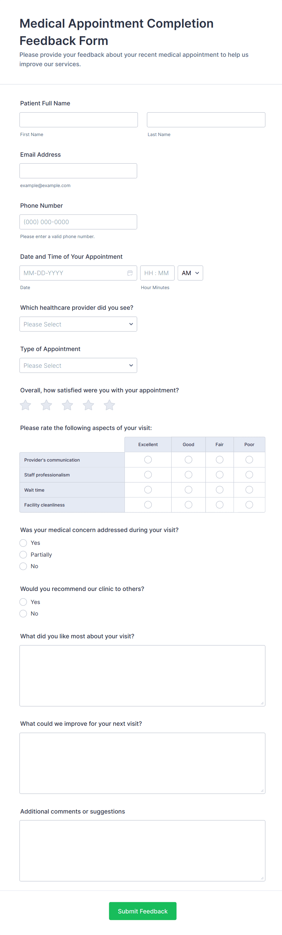 • Content and fields may vary based on the feedback focus. For example, a telemedicine feedback form may include questions about technology ease-of-use, while an inpatient survey might focus on room comfort and discharge instructions.