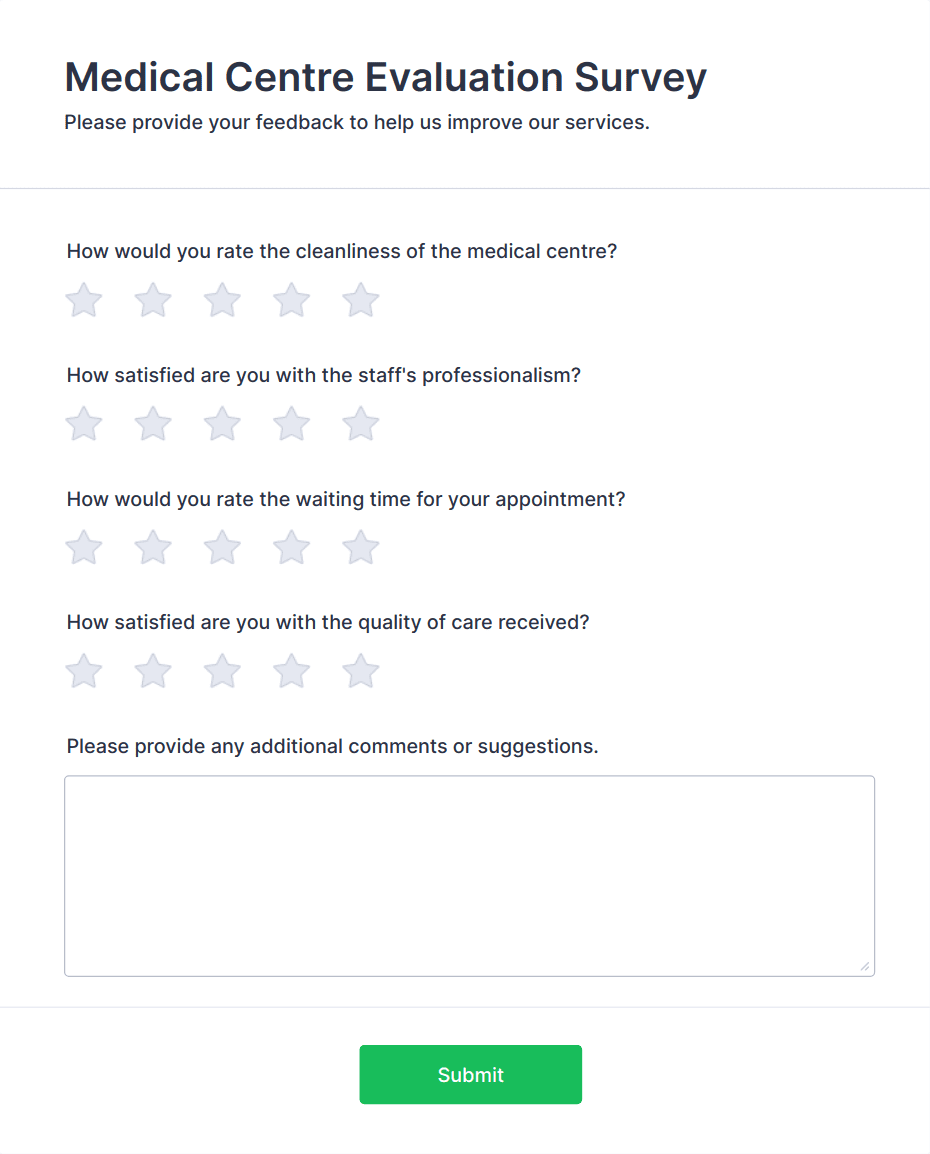 Medical surveys and questionnaires are essential tools used by healthcare professionals, researchers, clinics, and organizations to collect valuable information about patients’ health, medical histories, symptoms, treatment outcomes, and overall well-being. These forms can be used for a variety of purposes, such as patient intake, health risk assessments, satisfaction surveys, mental health screenings, post-visit feedback, and clinical research studies. By gathering structured data directly from patients or study participants, medical surveys and questionnaires help streamline workflows, improve patient care, and support evidence-based decision-making in healthcare settings.