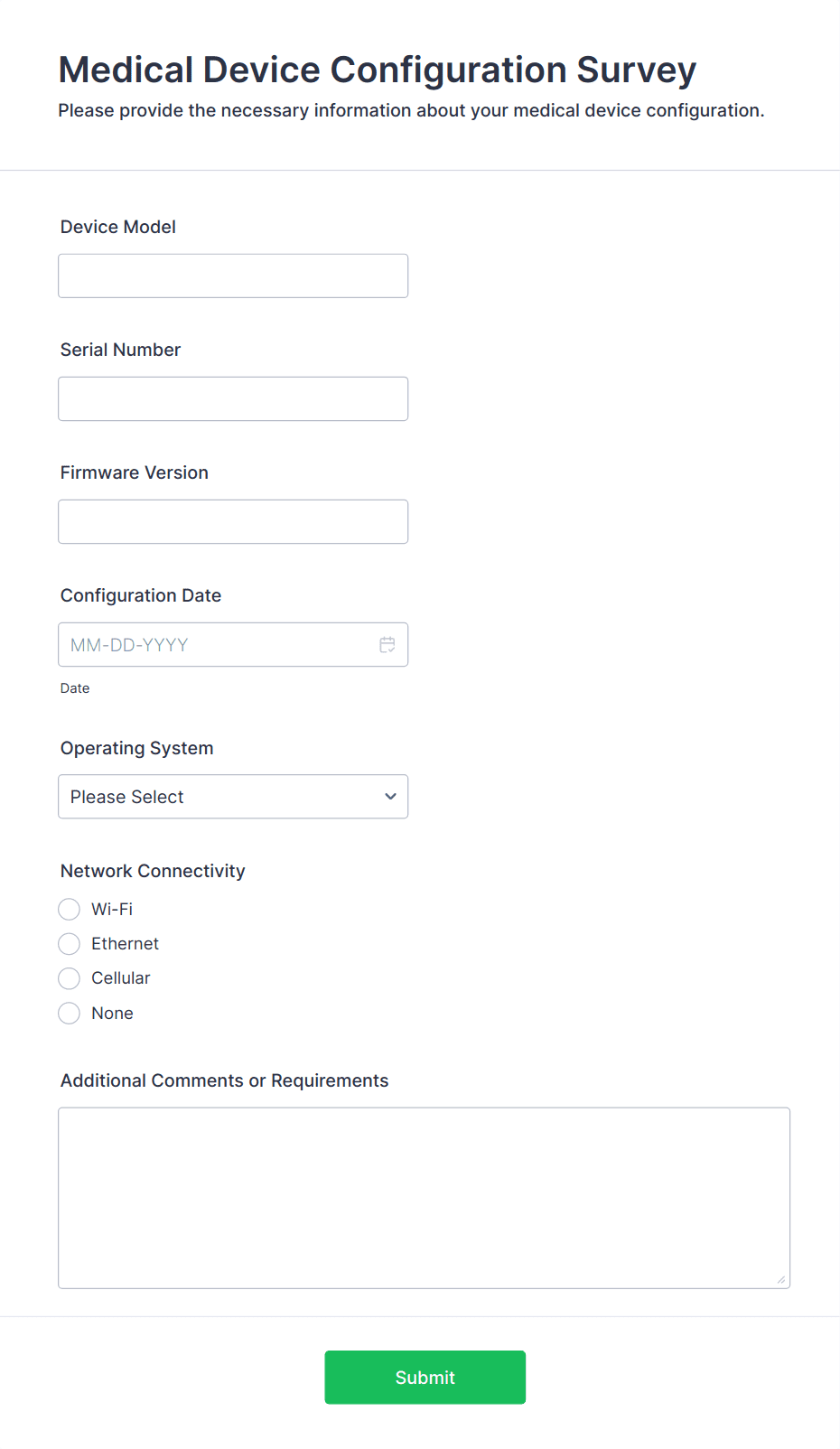 Medical surveys and questionnaires are essential tools used by healthcare professionals, researchers, clinics, and organizations to collect valuable information about patients’ health, medical histories, symptoms, treatment outcomes, and overall well-being. These forms can be used for a variety of purposes, such as patient intake, health risk assessments, satisfaction surveys, mental health screenings, post-visit feedback, and clinical research studies. By gathering structured data directly from patients or study participants, medical surveys and questionnaires help streamline workflows, improve patient care, and support evidence-based decision-making in healthcare settings.