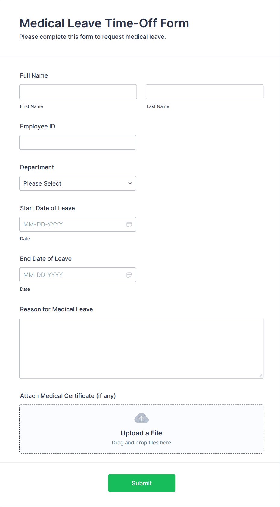 Common fields include employee name, department, type of leave, dates of absence, reason for leave, and any required supporting documentation.