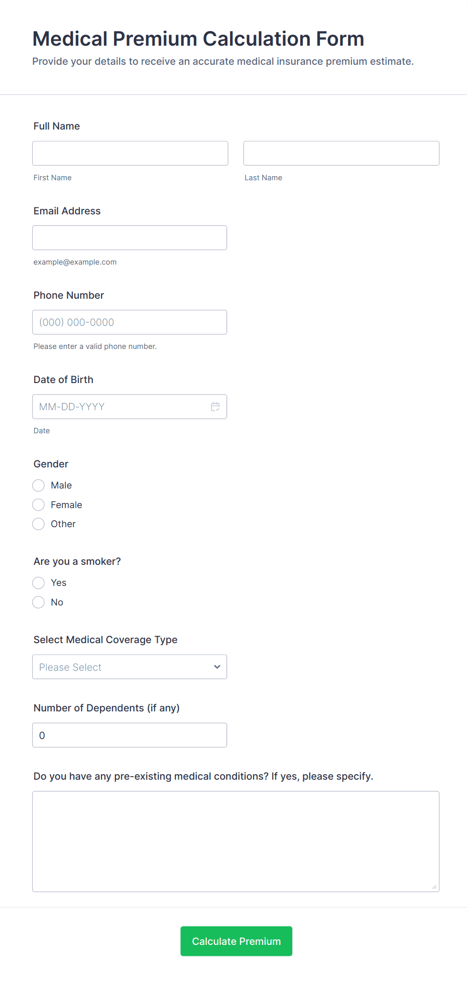 Calculation forms are specialized online forms designed to perform automatic calculations based on user input. These forms are commonly used to estimate costs, calculate totals, generate quotes, assess scores, or process any data that requires real-time mathematical operations. Typical use cases include order forms that tally product prices, loan calculators that estimate monthly payments, grade calculators for students, BMI calculators for health assessments, and budget planners for personal or business finance. Calculation forms streamline complex processes by providing instant results, reducing manual errors, and enhancing user experience.