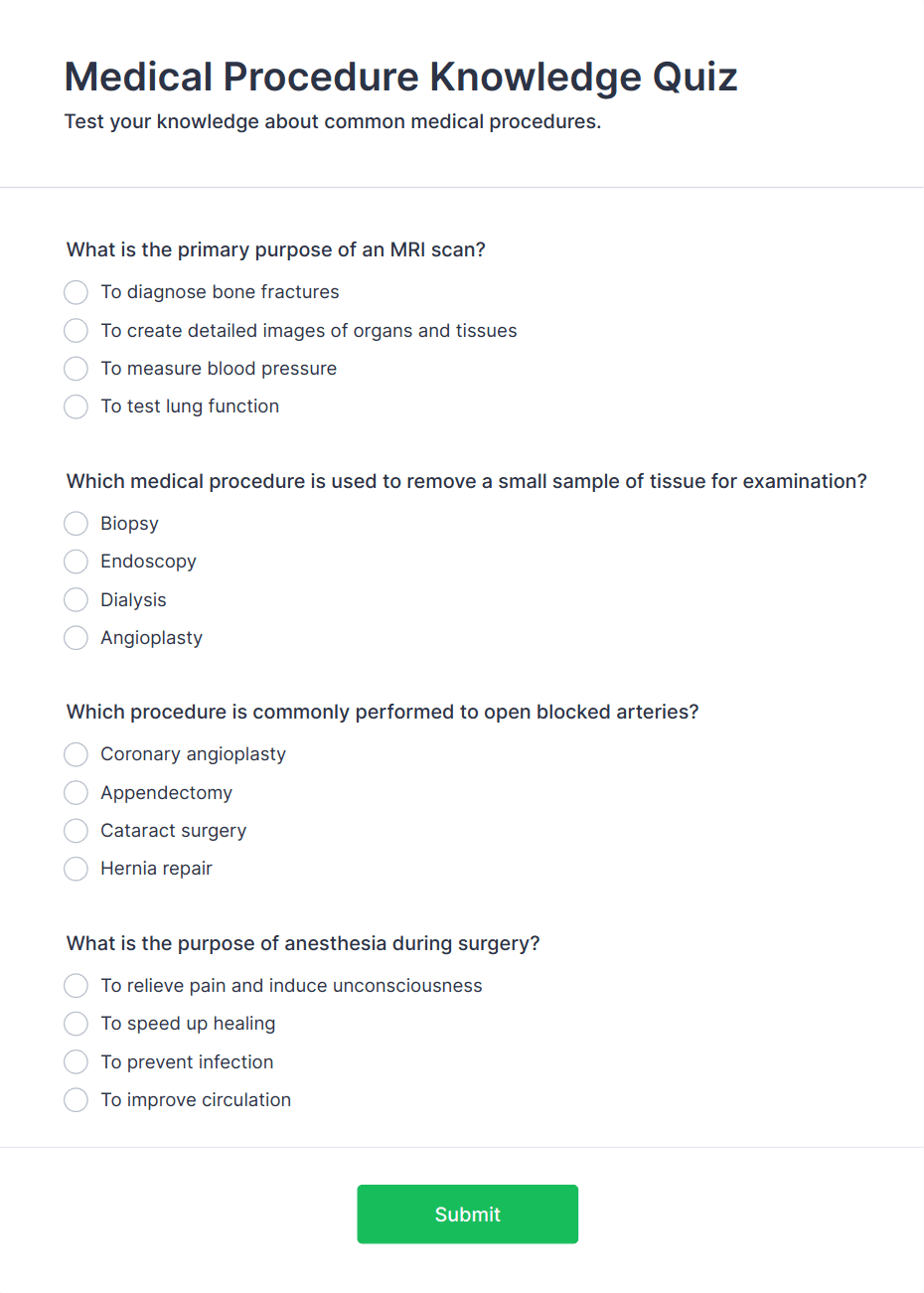 A medical survey or questionnaire is a structured form used to collect health-related information from patients, research participants, or the general public. It can cover topics such as medical history, symptoms, lifestyle, satisfaction, or treatment outcomes.