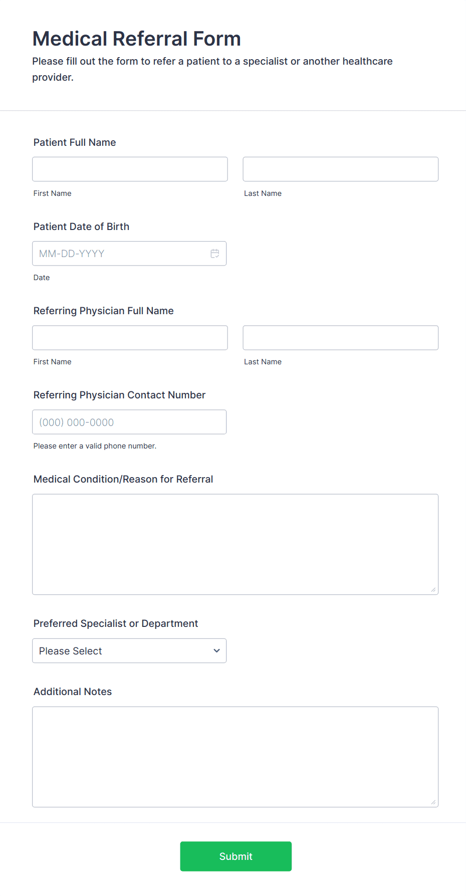A patient referral form is a document that is used by medical professionals in order to refer a patient to another doctor.
