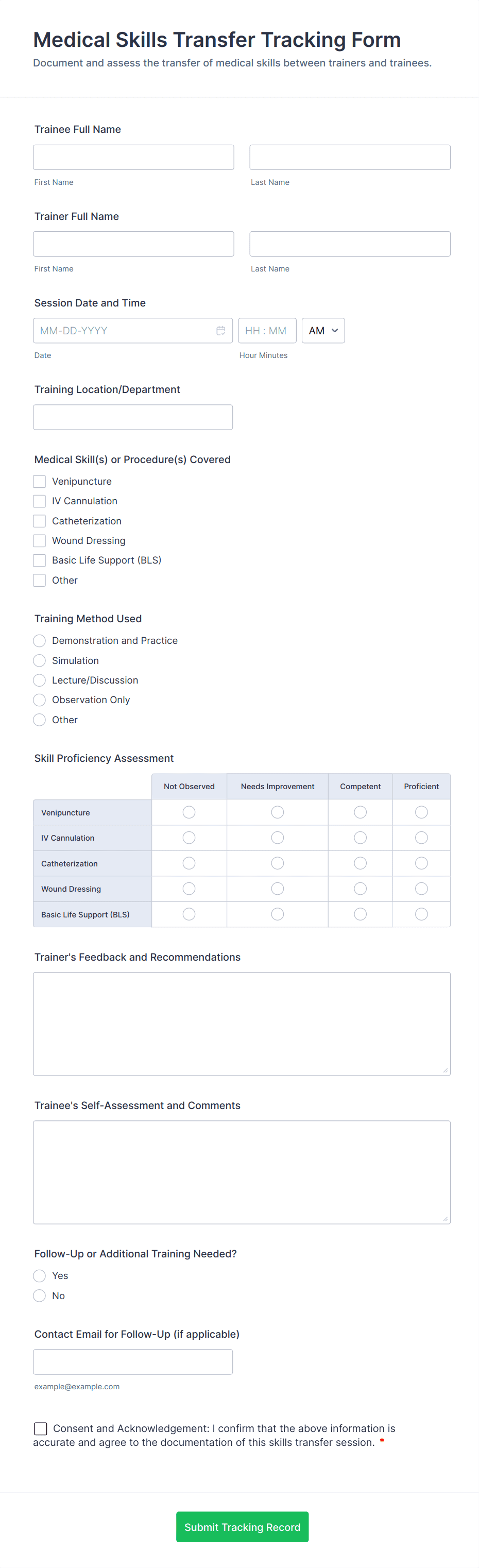 A tracking form is a digital tool used to record, monitor, and manage specific types of data over time, such as inventory levels, attendance, expenses, or project progress.