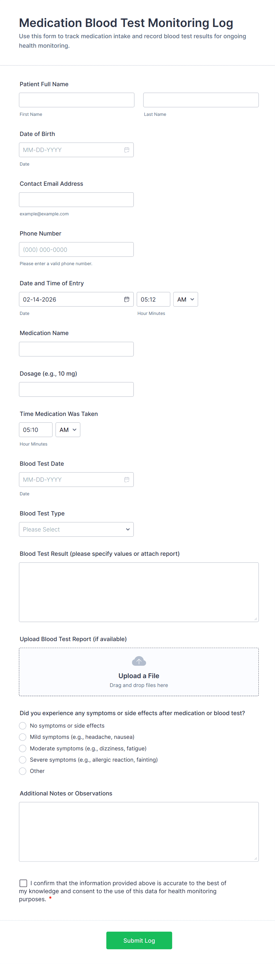 - Date/time pickers for logging when monitoring occurs.