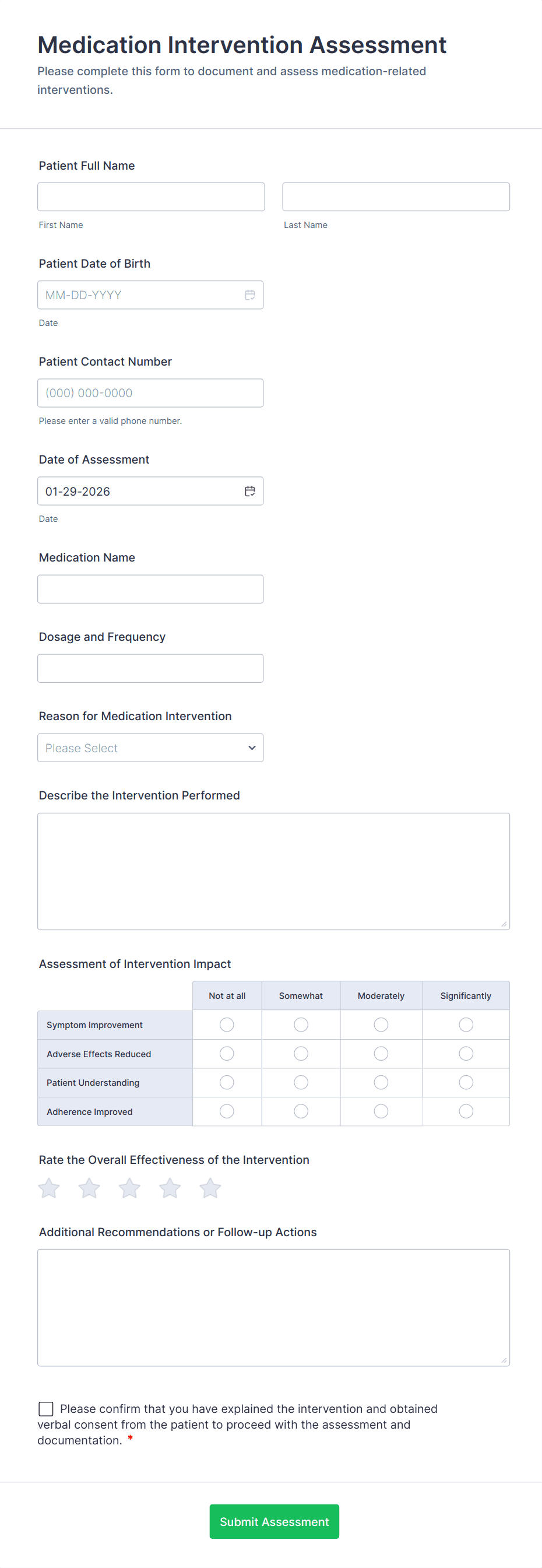Healthcare assessment forms are structured documents used to collect and evaluate patient health information to support clinical decisions, care planning, and ongoing monitoring. They help healthcare teams capture consistent details about symptoms, medical history, risk factors, functional status, and care needs in a clear and organized way. Healthcare assessment forms are commonly used in clinics, hospitals, telehealth services, rehabilitation centers, home care, and specialty practices for intake assessments, screening evaluations, follow-up check-ins, and condition monitoring. By standardizing assessment workflows, these forms improve documentation quality, reduce missing information, and support safer, more coordinated care.