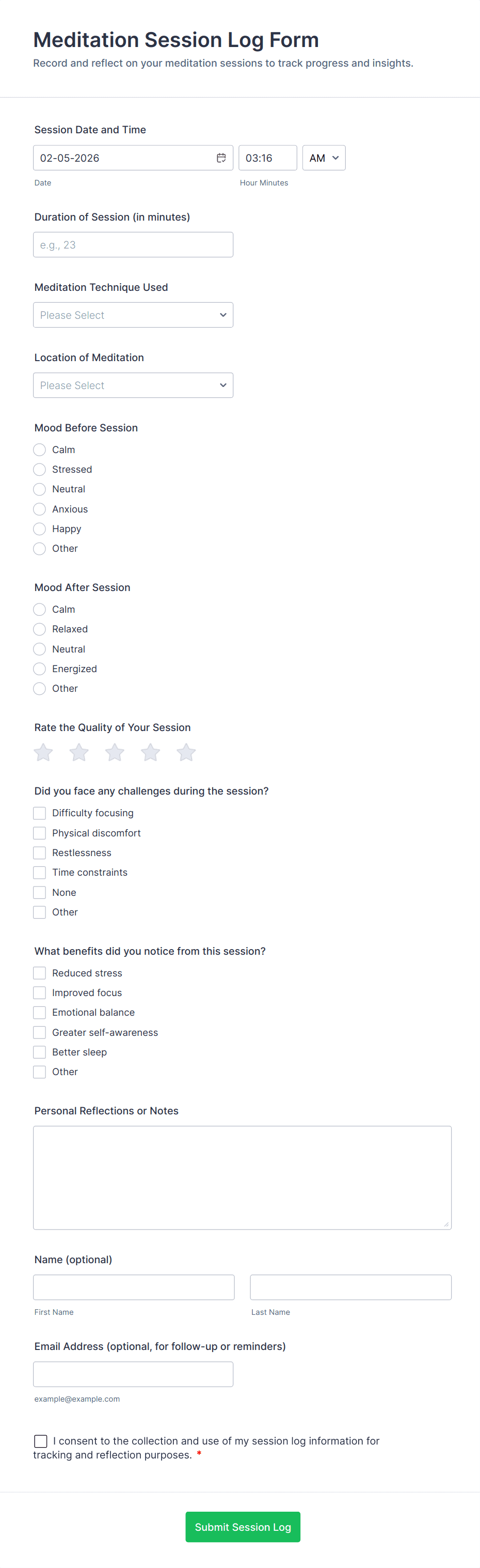 - For fitness tracking: activity type dropdowns, duration fields, and notes.