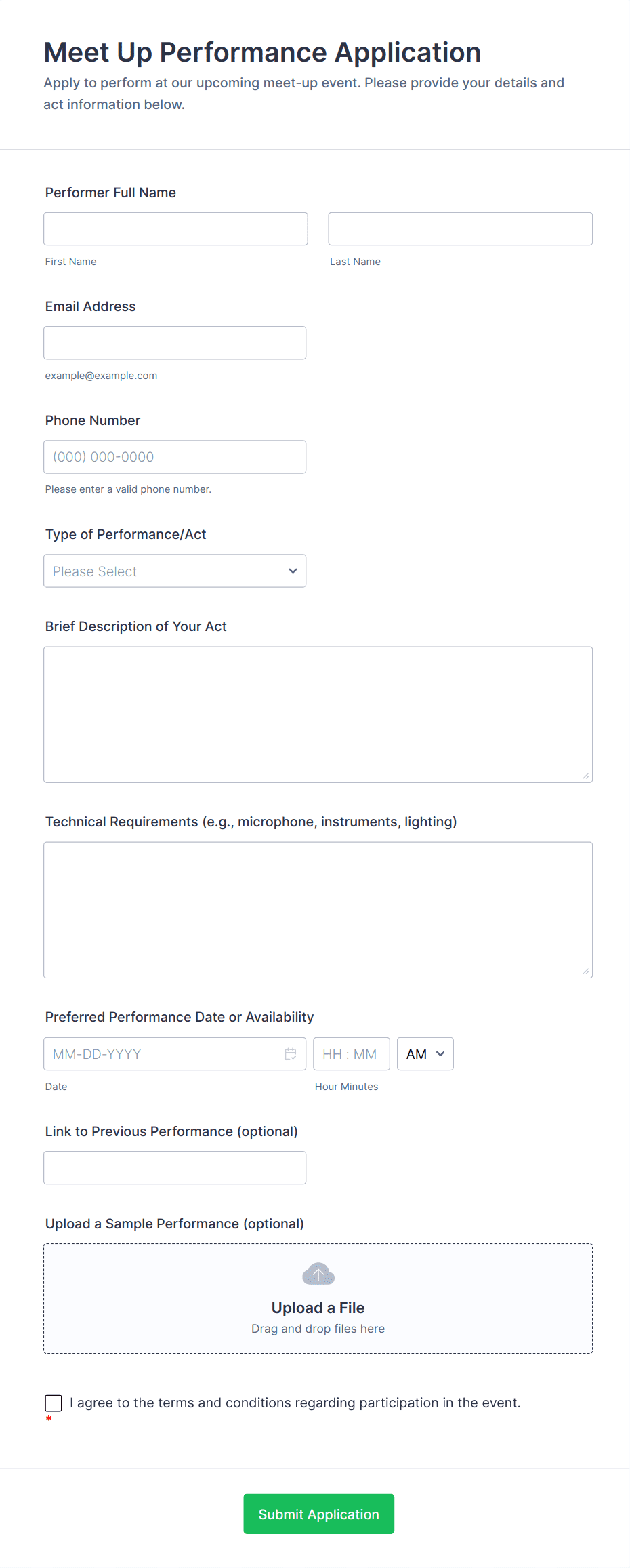 Entertainment Forms are specialized online forms designed to streamline processes within the entertainment industry, including event planning, talent management, audience engagement, and more. These forms can be used for a variety of purposes such as event registrations, ticket bookings, talent auditions, feedback collection, contest entries, and guest list management. Whether you’re organizing a concert, managing a film festival, running a comedy show, or hosting a virtual gaming tournament, Entertainment Forms help you efficiently gather and manage information from participants, attendees, and staff.