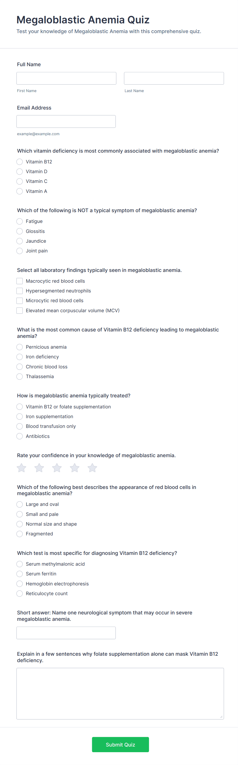 Quiz Templates are pre-designed forms specifically created to facilitate the process of building quizzes for a variety of purposes, such as education, employee training, lead generation, event engagement, and more. These templates provide a structured way to present questions, collect answers, and automatically score or evaluate responses. Whether you’re a teacher assessing student knowledge, a business running a product knowledge test, or a marketer creating a fun personality quiz, Quiz Templates offer a flexible foundation to suit your needs. They can be used for online exams, trivia games, onboarding assessments, customer feedback quizzes, and interactive learning modules.