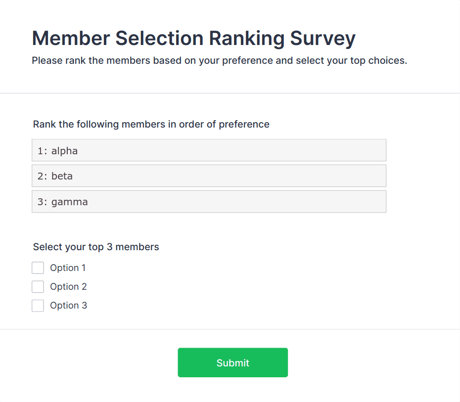 A voting form is an online tool used to collect votes, preferences, or opinions from a group of participants for decision-making, elections, or polls.