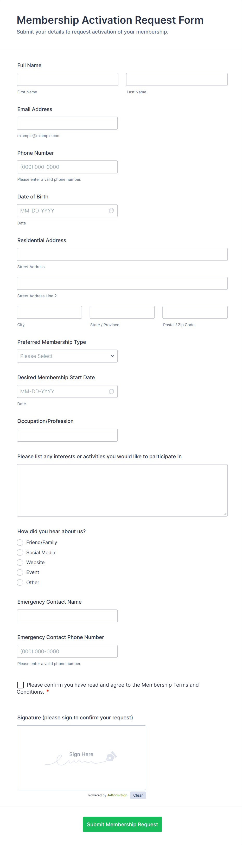 Membership forms are used by clubs, gyms, professional associations, nonprofits, community groups, and any organization that manages a member base.