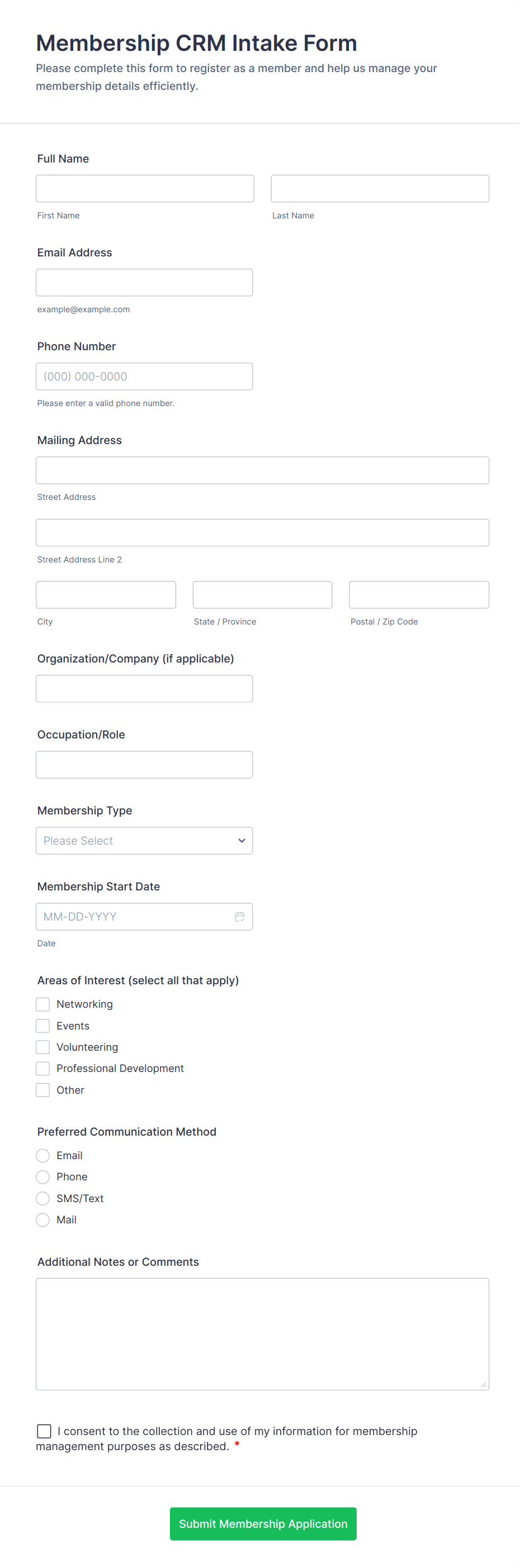 Membership forms are used by clubs, gyms, professional associations, nonprofits, community groups, and any organization that manages a member base.