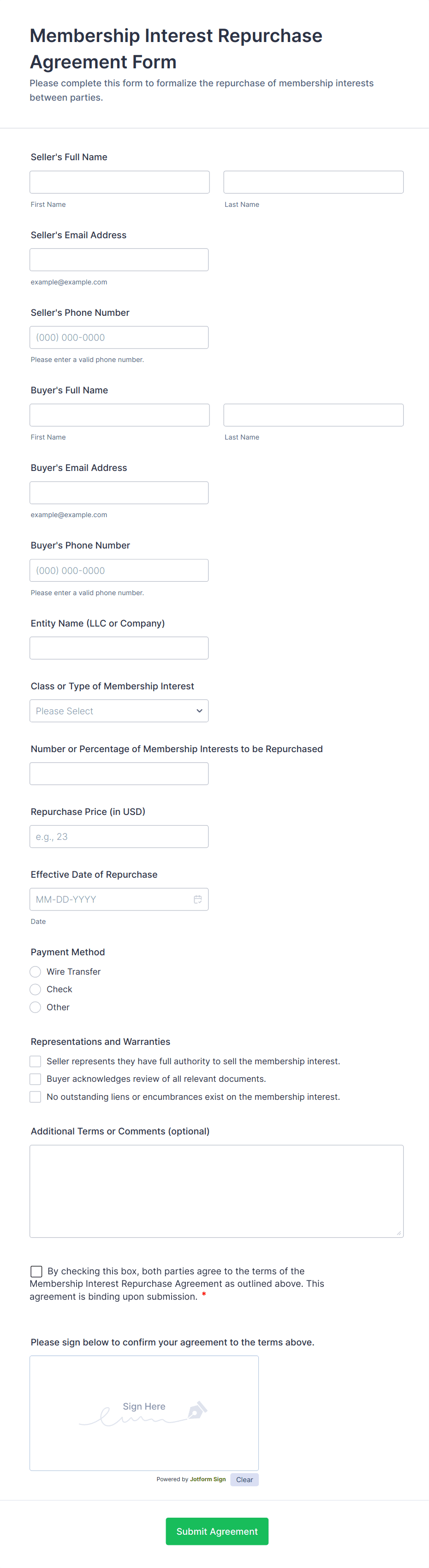The form templates here are for informational purposes only. Jotform is not providing legal, financial, or other advice, or implying that the forms are legally valid in all or any jurisdictions. Before using any such form, consult an attorney and/or other applicable professionals to make sure that the form meets your needs, legally and otherwise.