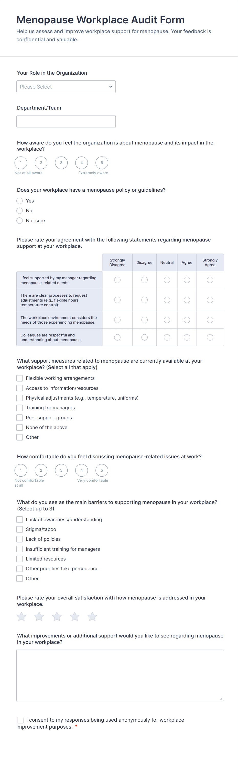 • For onboarding or exit surveys, add fields about the hiring process, training, or reasons for leaving.
