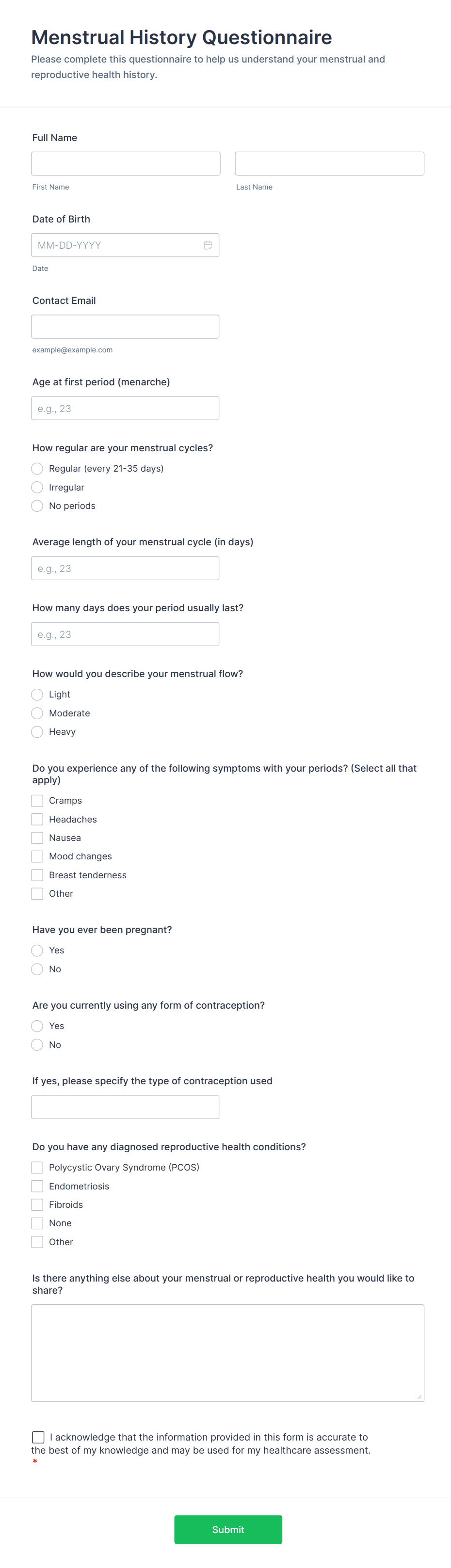 • For health risk assessments, include checkboxes or multiple-choice questions about lifestyle, family history, and specific risk factors.