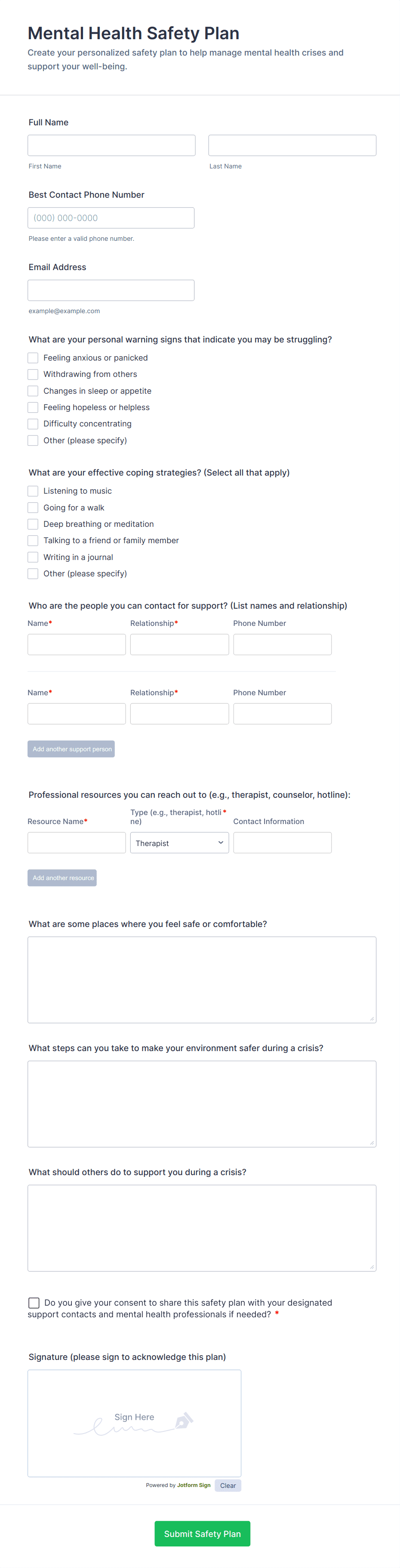 Creating a mental health form with Jotform helps you collect sensitive information in a clear, respectful, and structured way. A well-designed form should feel easy to complete while still capturing the details needed for support or care decisions.