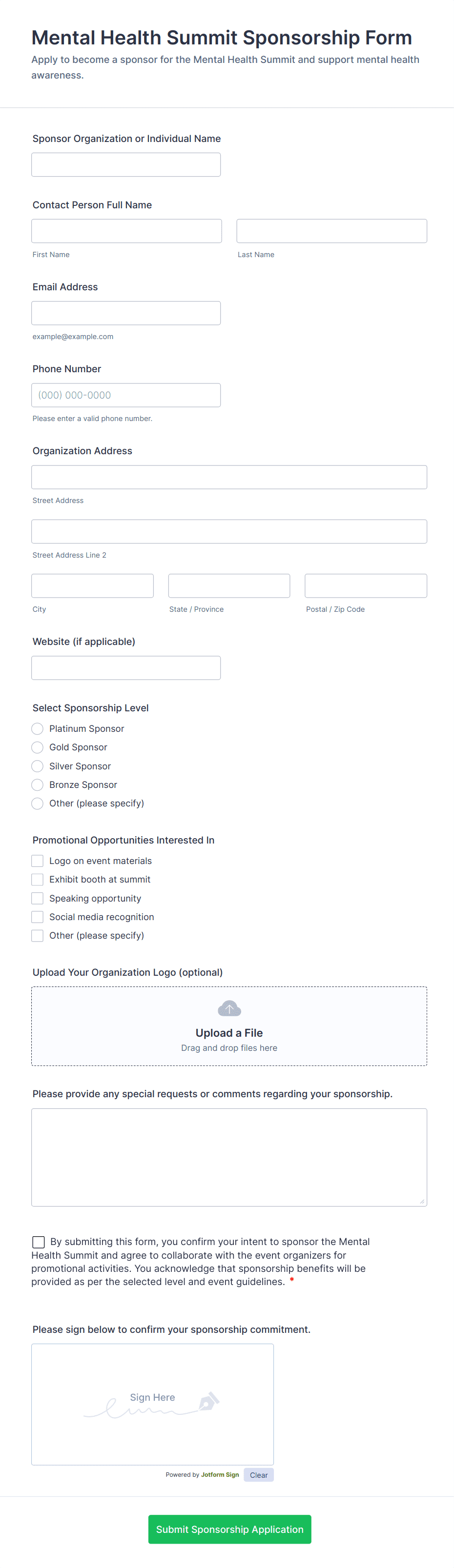 Typical fields include sponsor name, contact details, organization, sponsorship level or package, contribution amount, payment method, recognition preferences, and agreement to terms.