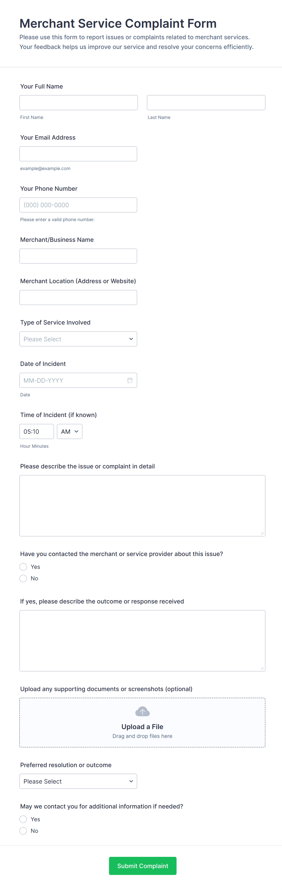 • Use conditional logic to show or hide fields based on user responses (e.g., display additional questions if the complaint is about a specific service).