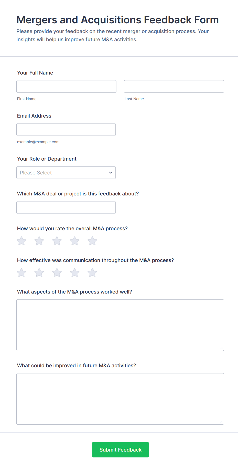 • Content and Fields: Customer surveys may focus on service ratings and open-ended feedback, while employee surveys might include questions about workplace environment and leadership. Market research surveys often use demographic fields and multiple-choice questions, whereas product feedback forms may include rating scales and feature-specific queries.
