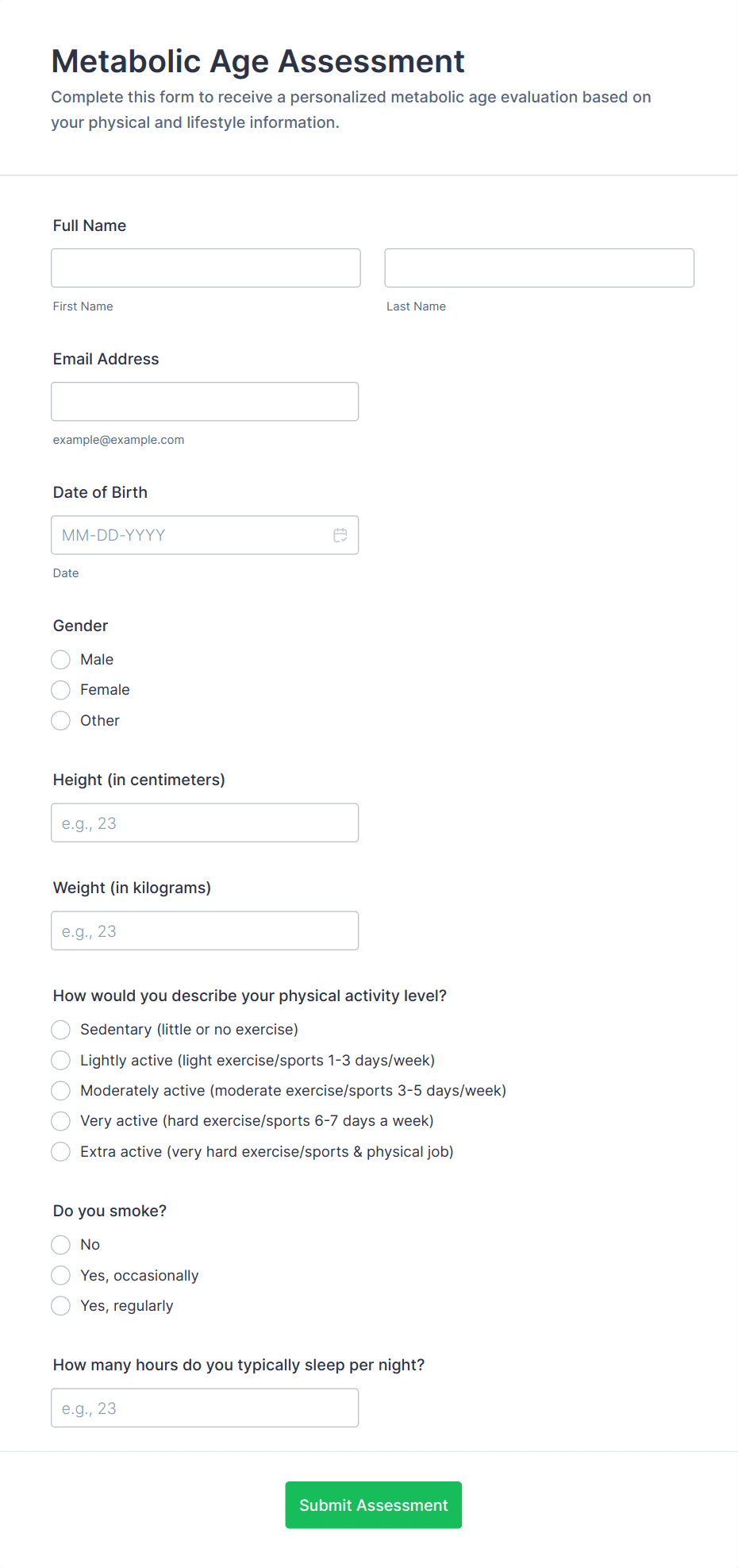 Healthcare assessment forms are structured documents used to collect and evaluate patient health information to support clinical decisions, care planning, and ongoing monitoring. They help healthcare teams capture consistent details about symptoms, medical history, risk factors, functional status, and care needs in a clear and organized way. Healthcare assessment forms are commonly used in clinics, hospitals, telehealth services, rehabilitation centers, home care, and specialty practices for intake assessments, screening evaluations, follow-up check-ins, and condition monitoring. By standardizing assessment workflows, these forms improve documentation quality, reduce missing information, and support safer, more coordinated care.