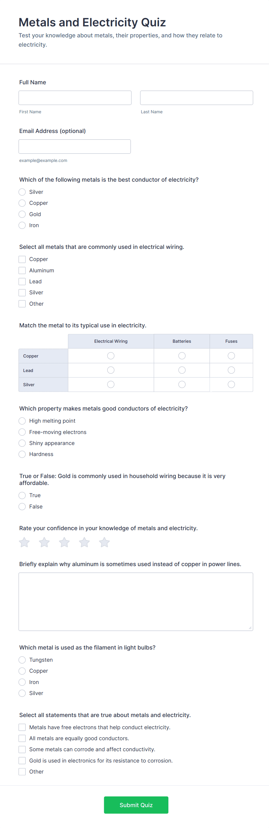 Quiz Templates are pre-designed forms specifically created to facilitate the process of building quizzes for a variety of purposes, such as education, employee training, lead generation, event engagement, and more. These templates provide a structured way to present questions, collect answers, and automatically score or evaluate responses. Whether you’re a teacher assessing student knowledge, a business running a product knowledge test, or a marketer creating a fun personality quiz, Quiz Templates offer a flexible foundation to suit your needs. They can be used for online exams, trivia games, onboarding assessments, customer feedback quizzes, and interactive learning modules.
