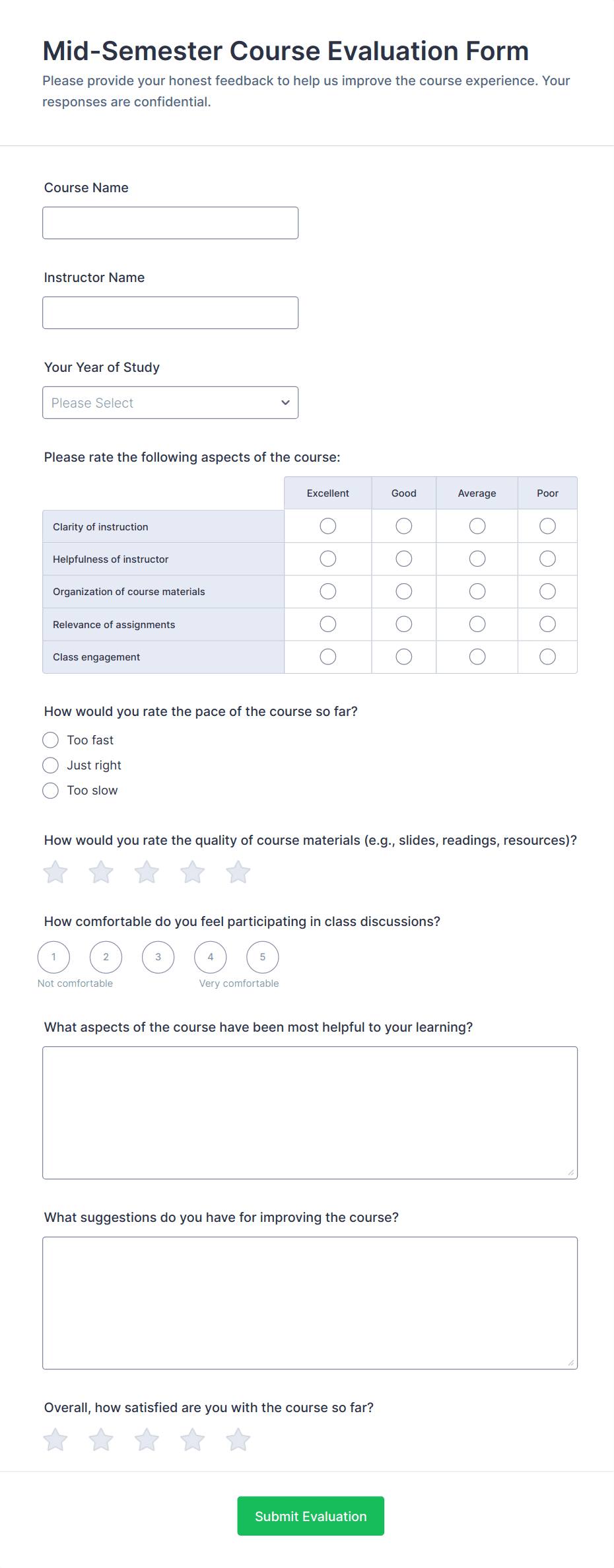 - Multiple choice or rating scale questions (e.g., “Rate the instructor’s effectiveness”)