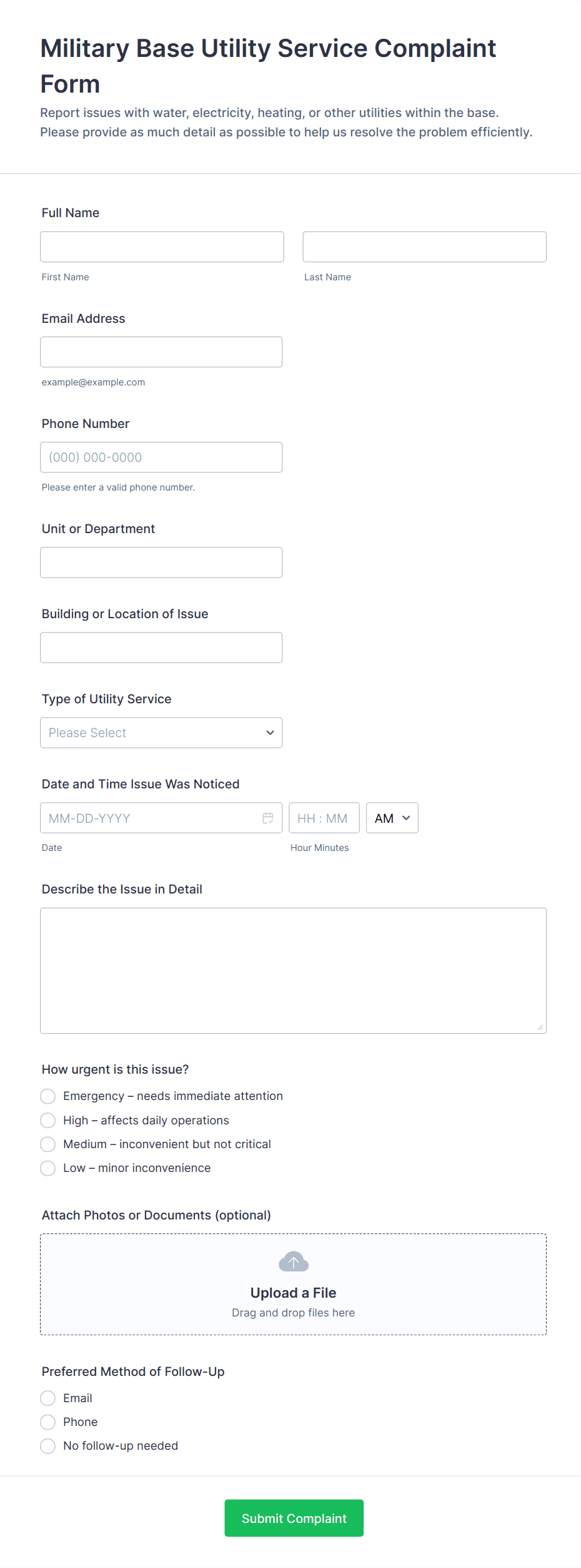 • Use conditional logic to show or hide fields based on user responses (e.g., display additional questions if the complaint is about a specific service).