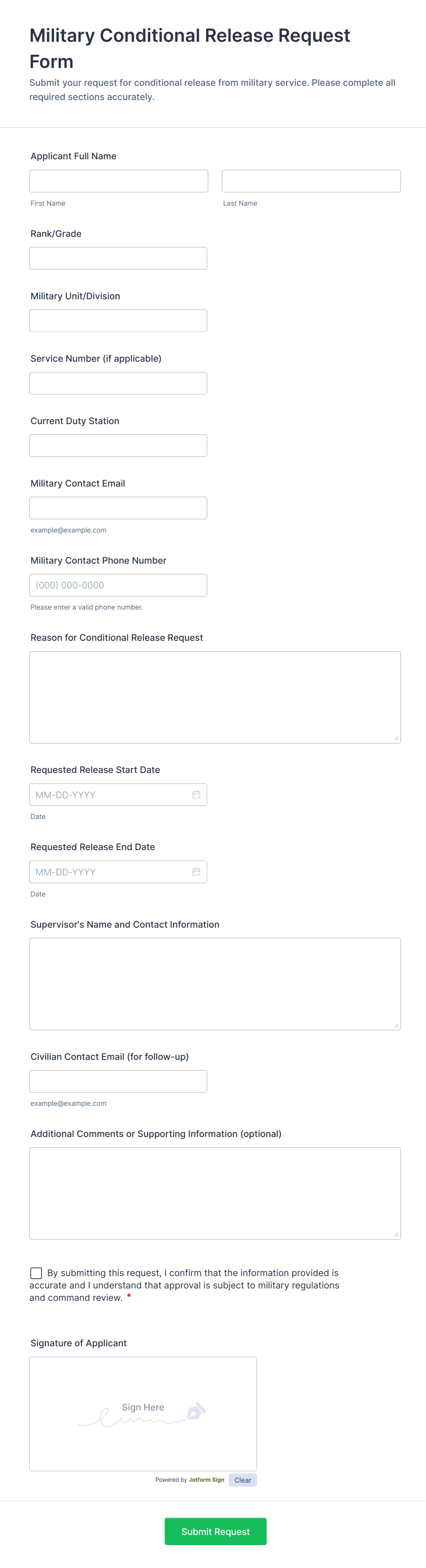 The form templates here are for informational purposes only. Jotform is not providing legal, financial, or other advice, or implying that the forms are legally valid in all or any jurisdictions. Before using any such form, consult an attorney and/or other applicable professionals to make sure that the form meets your needs, legally and otherwise.