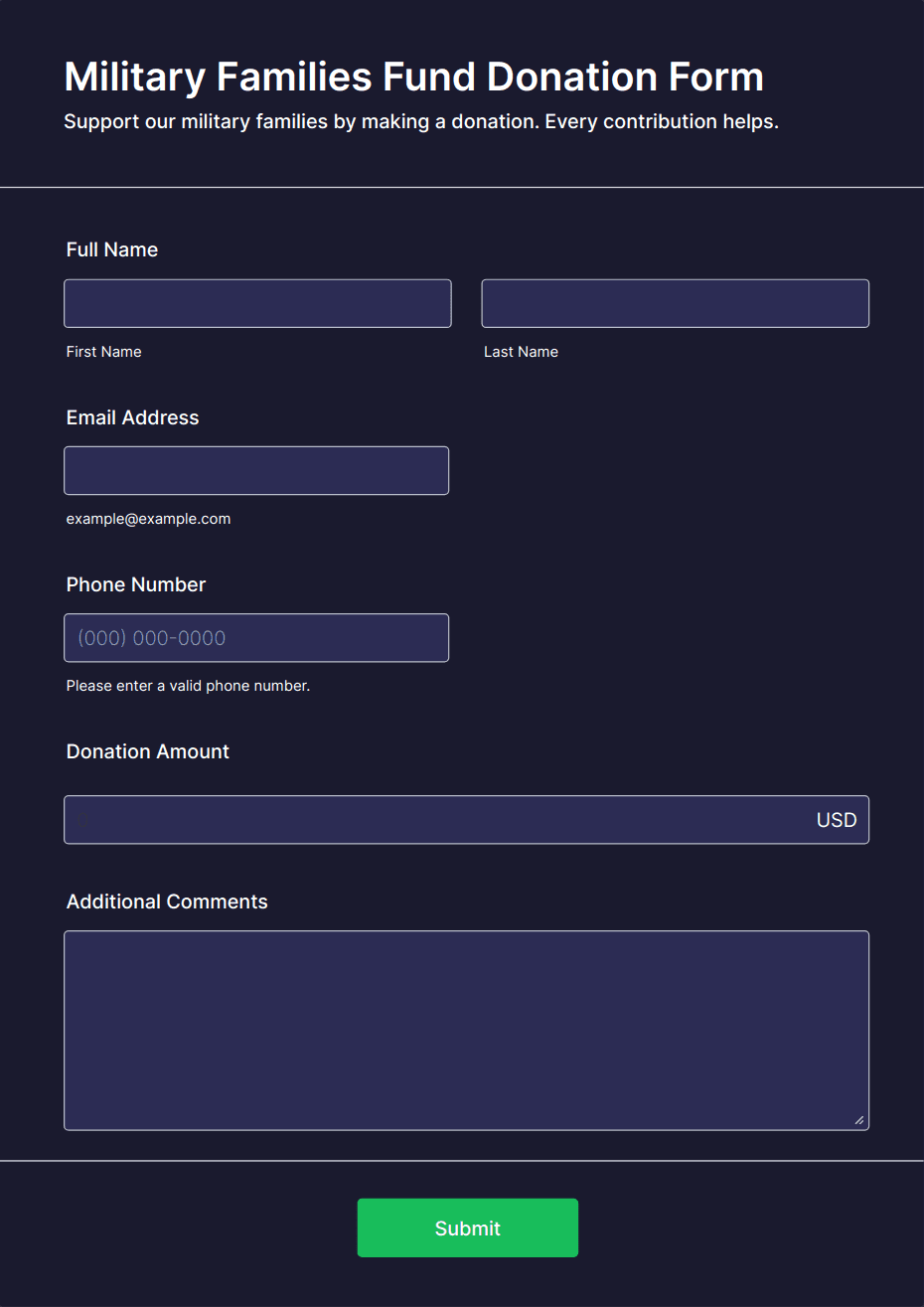Donation forms are specialized online forms designed to collect contributions for charitable organizations, fundraising campaigns, nonprofit initiatives, and community projects. These forms streamline the process of gathering donor information, processing payments, and tracking contributions, making it easier for organizations to raise funds efficiently. Donation forms can be used for a variety of purposes, such as one-time or recurring donations, event sponsorships, crowdfunding efforts, membership drives, and emergency relief campaigns. They are essential tools for nonprofits, schools, religious groups, and community organizations seeking to engage supporters and facilitate secure, convenient giving.