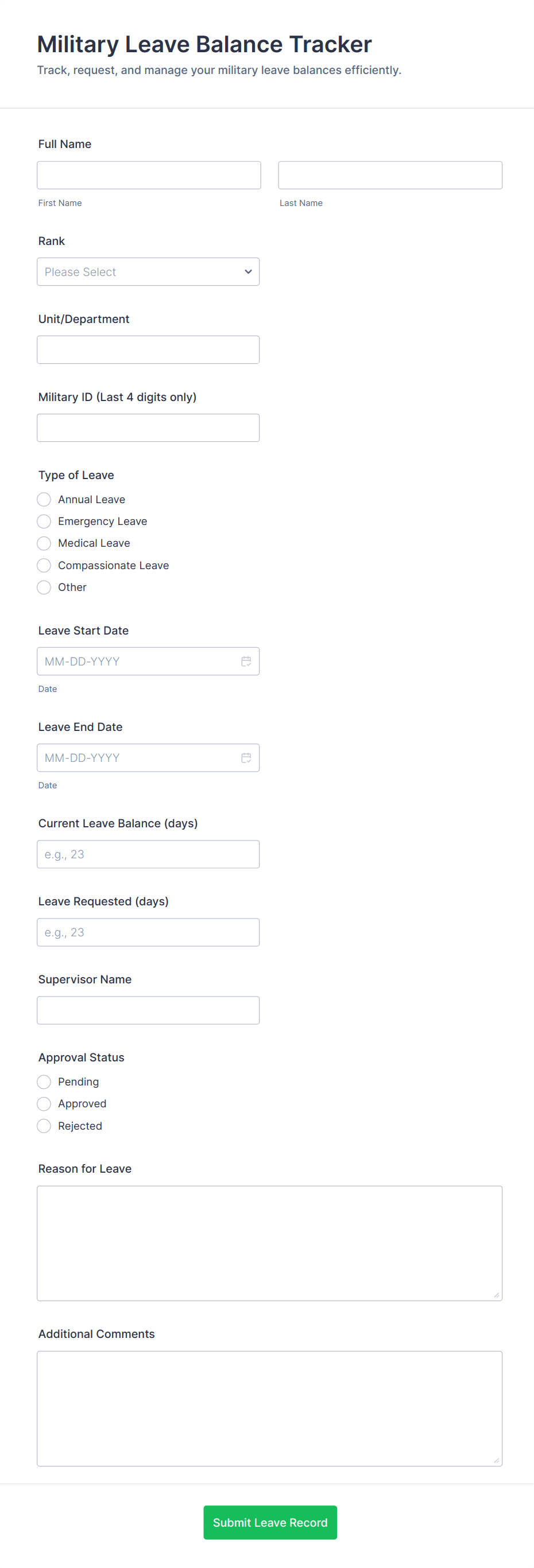 Leave Request Form Templates are digital forms designed to streamline the process of requesting and managing employee absences within organizations. These templates are commonly used by HR departments, team leaders, and managers to collect essential information from employees who need to take time off for reasons such as vacation, sick leave, personal days, parental leave, or other special circumstances. By standardizing the leave request process, these forms help ensure that all necessary details—such as dates, type of leave, reason for absence, and approval status—are captured efficiently and consistently. Use cases range from small businesses tracking vacation days to large enterprises managing complex leave policies across multiple departments.