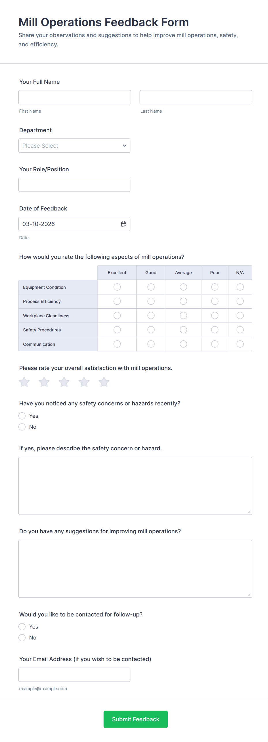 Manufacturing forms are online forms used to collect manufacturing information like product and supply orders, inventory reports, feedback, applications, and more. With these ready-made Manufacturing Forms from Jotform, you can save time and paper by switching from messy paper forms to efficient only forms you can fill out on any device.